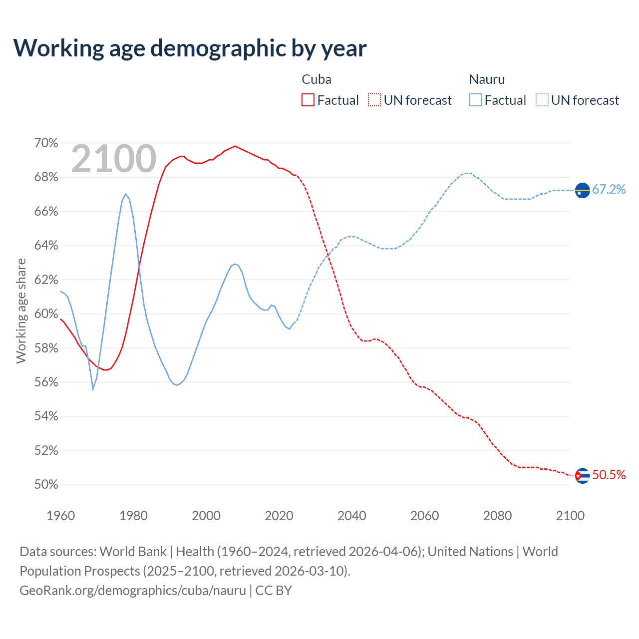 - Cuba has 7.42M working age adults (aged 15-64) vs 7.2K in Nauru.