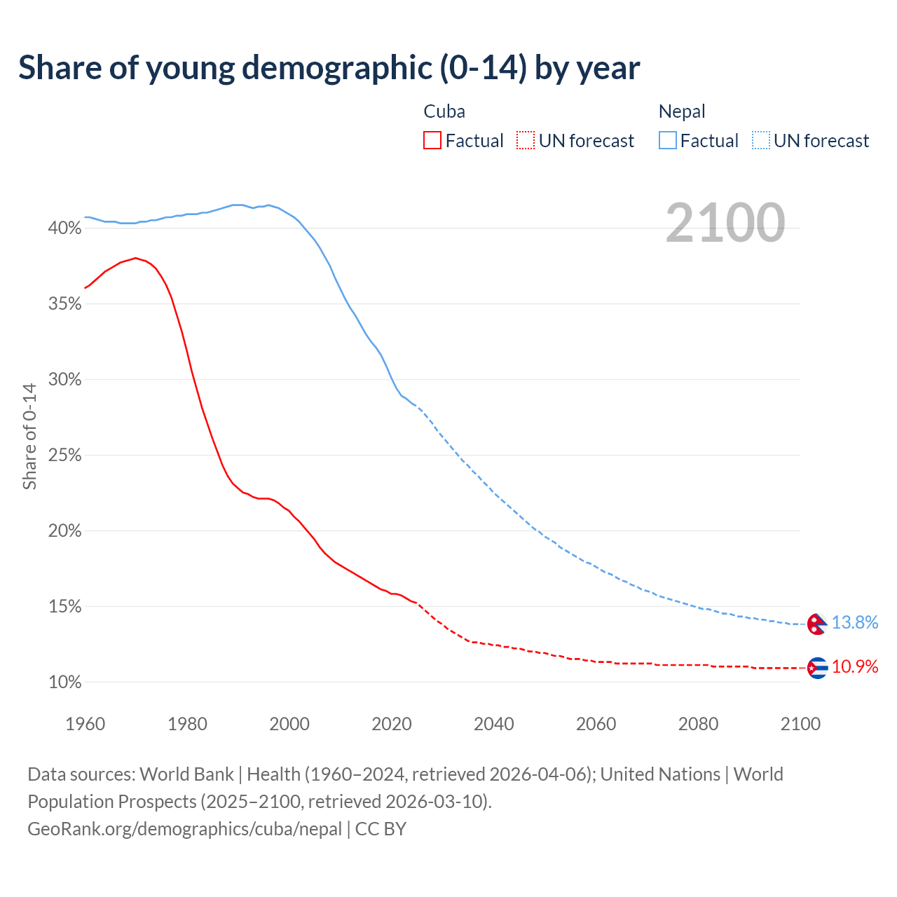 - The share of young demographic (0-15 years old) in Cuba is 15.3% vs 28.4% in Nepal.
