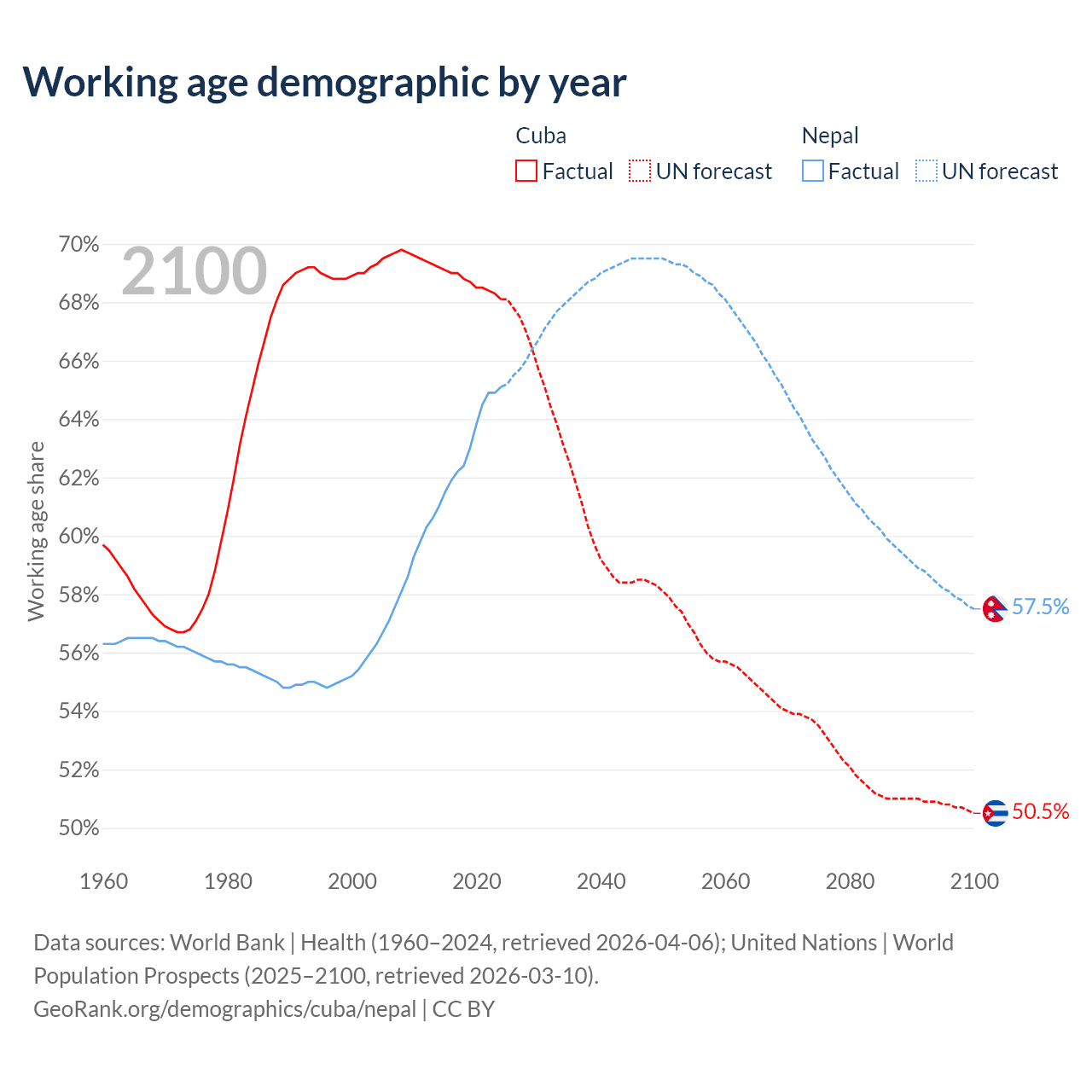 - The share of old-age demographic (65+) in Cuba is 16.6% vs 6.5% in Nepal.