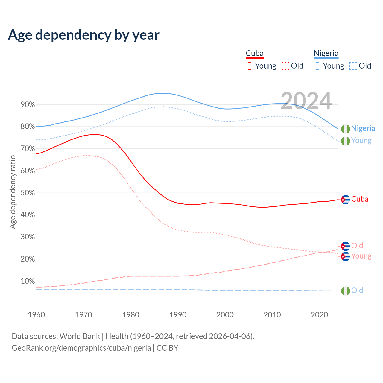 - Cuba is ranked 27/196 by median age (oldest to youngest) vs 178/196 for Nigeria.
