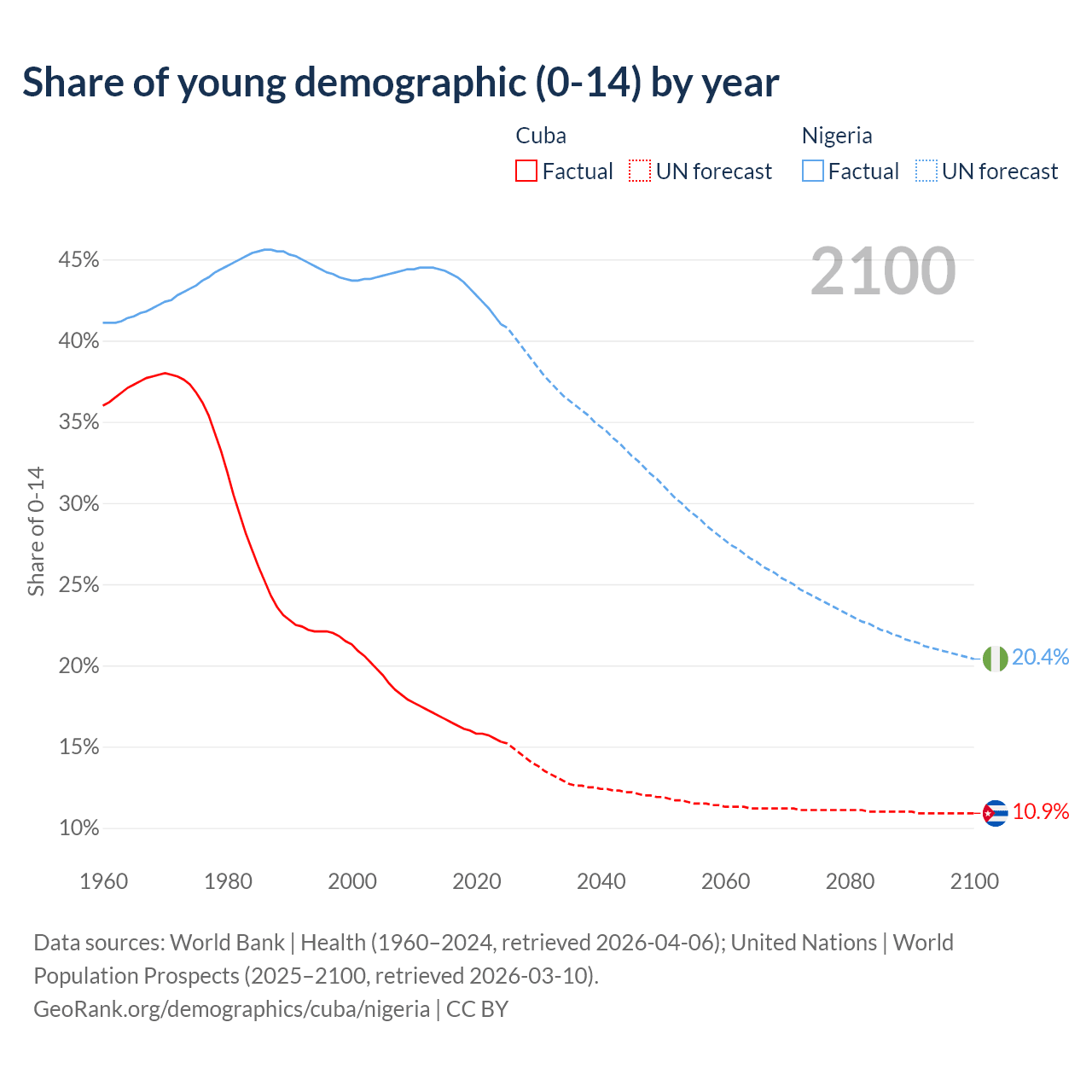 - The share of young demographic (0-15 years old) in Cuba is 15.3% vs 41% in Nigeria.