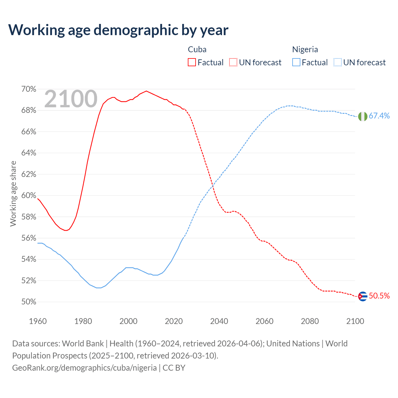 - Cuba has 7.42M working age adults (aged 15-64) vs 136M in Nigeria.