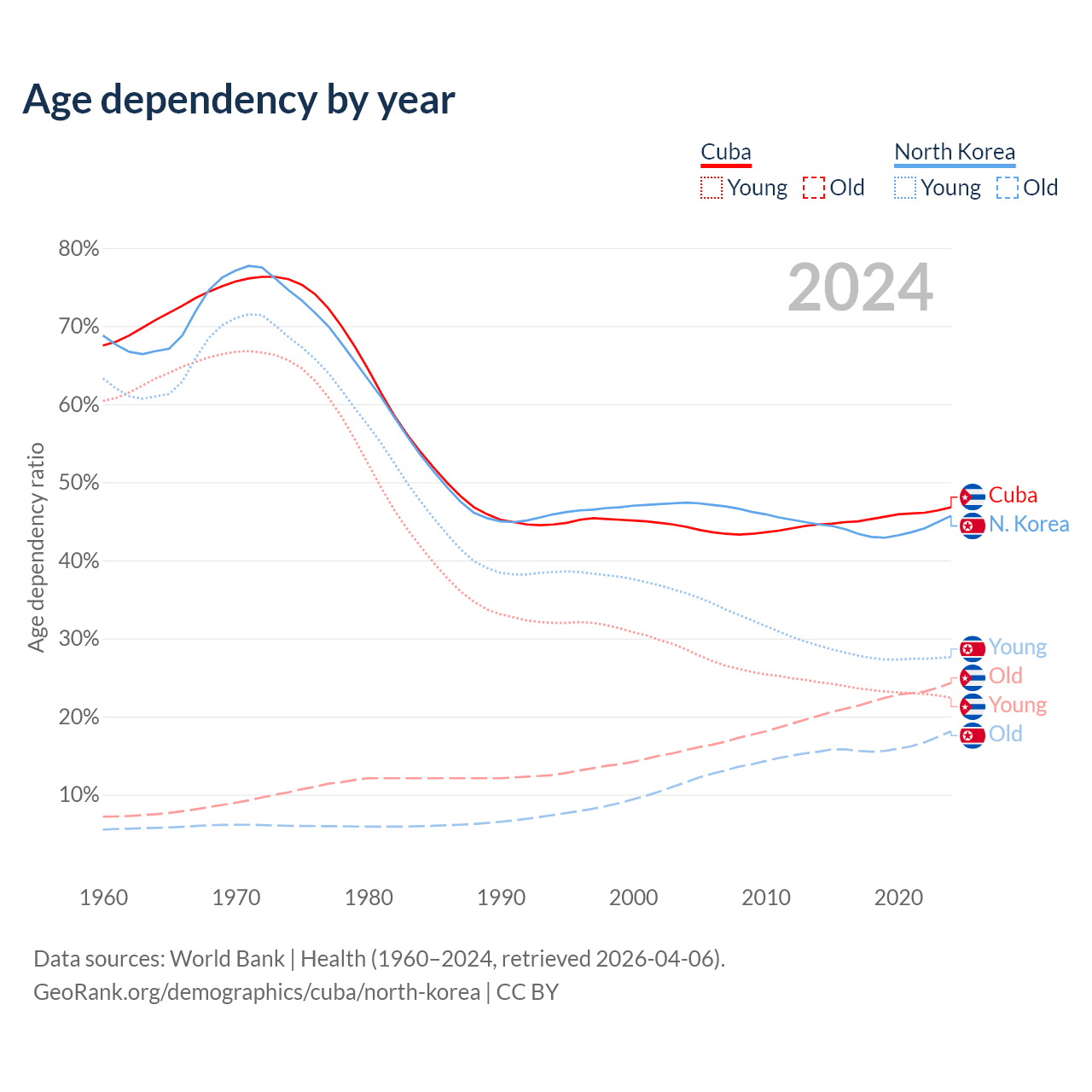 - Cuba is ranked 27/196 by median age (oldest to youngest) vs 62/196 for North Korea.