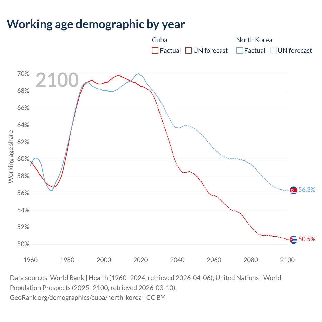- Cuba has 7.42M working age adults (aged 15-64) vs 18.3M in North Korea.