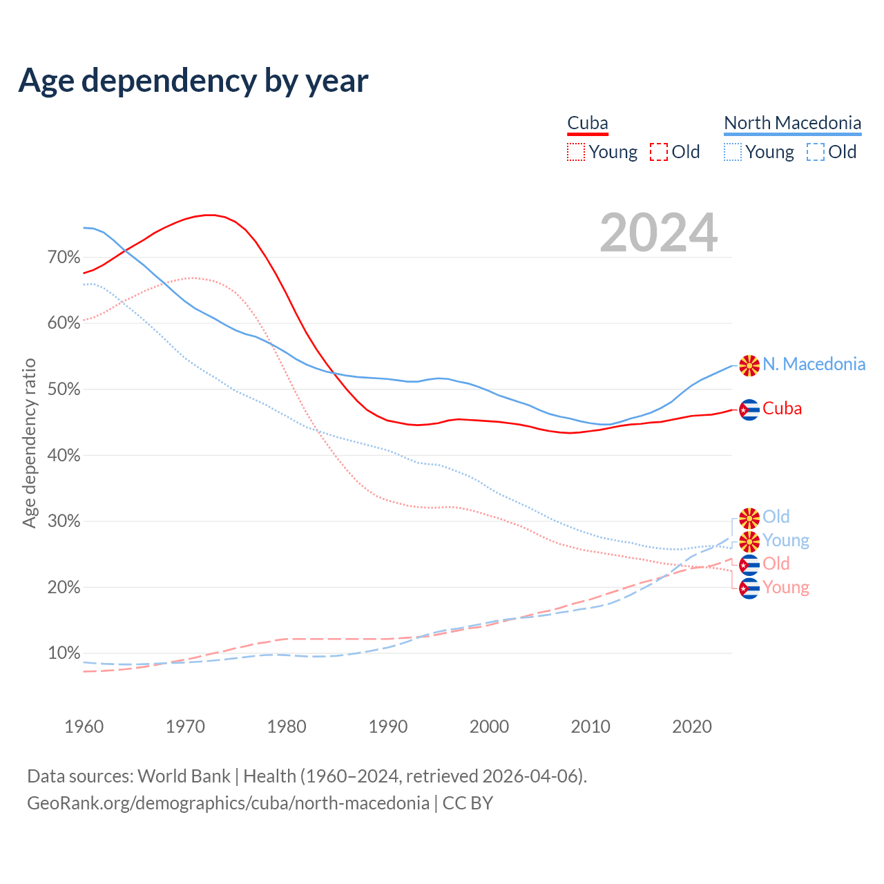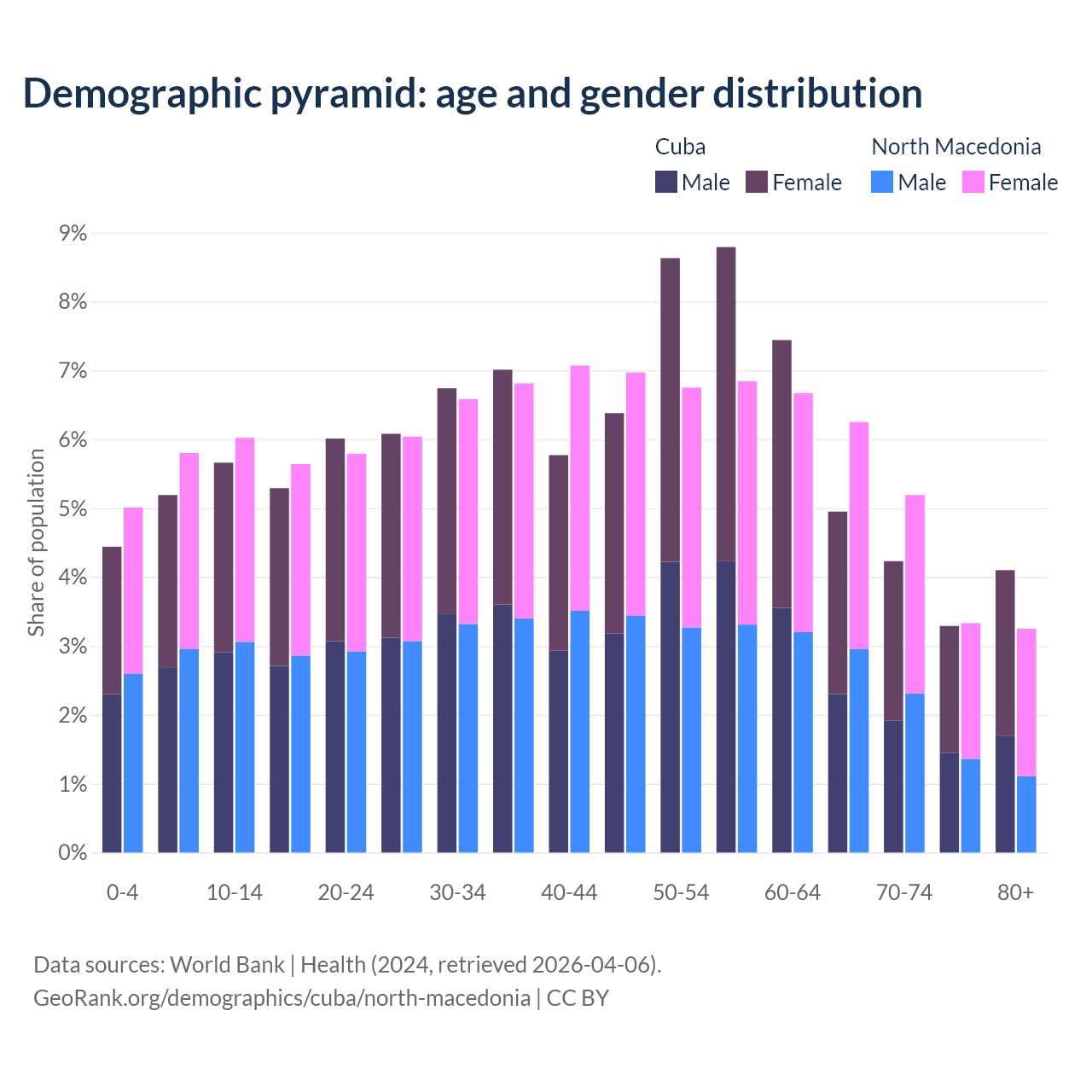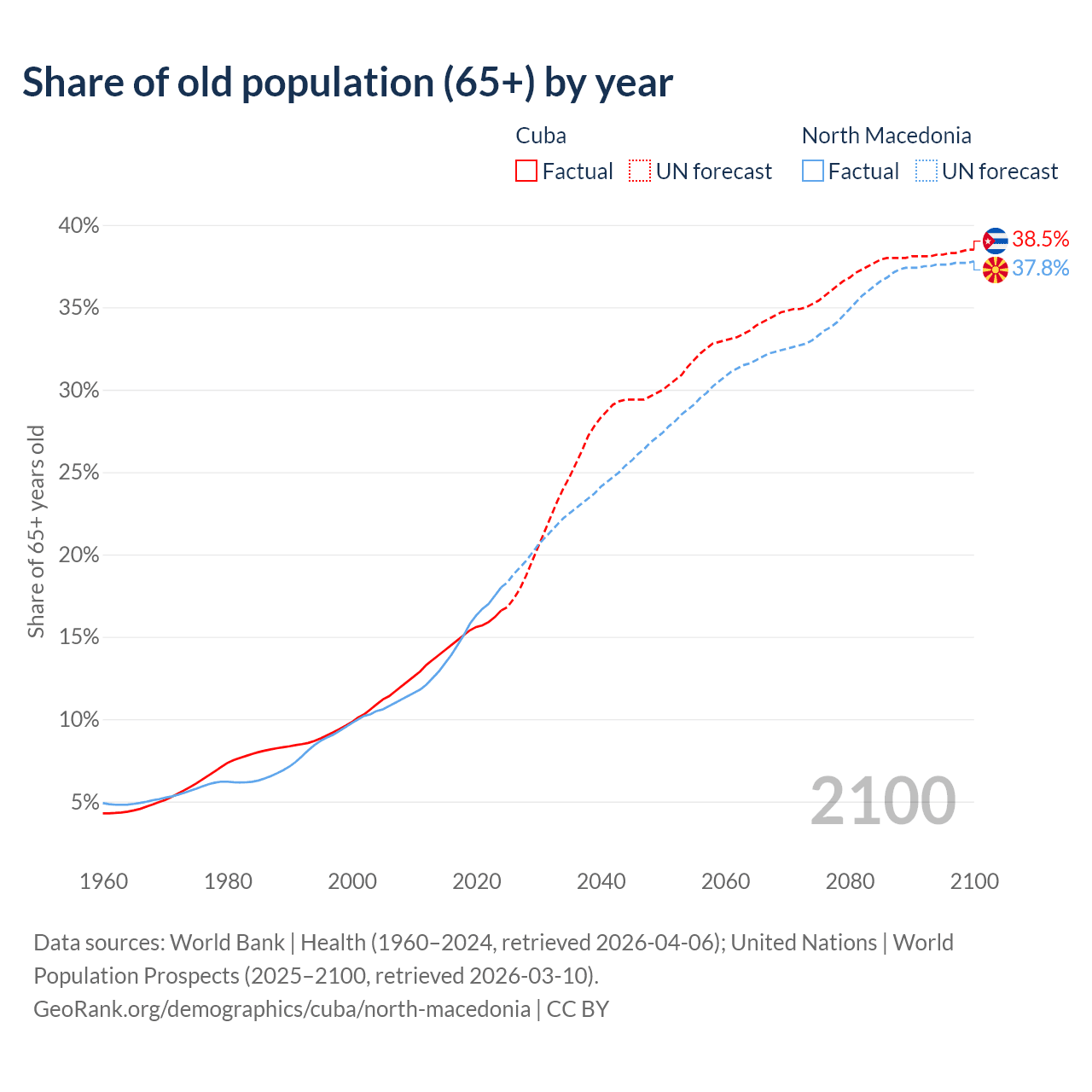 The share of older people aged 65 and over is 16.6% in Cuba and 18% in North Macedonia. Life expectancy in Cuba compared to North Macedonia .