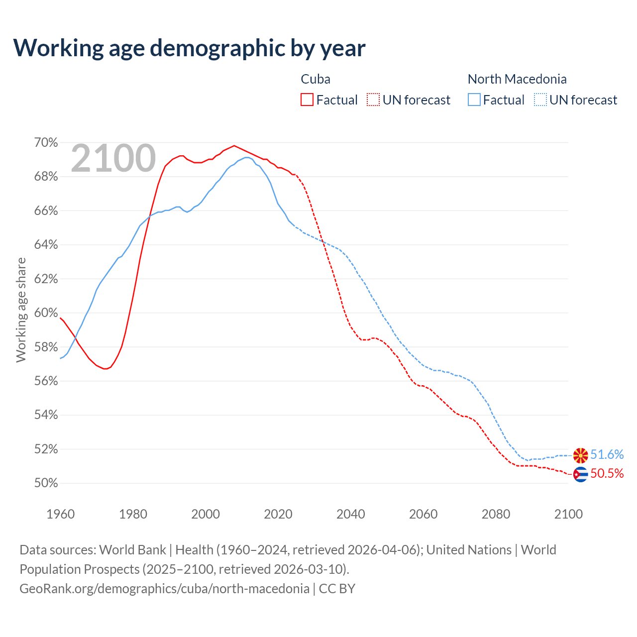 - Cuba has 7.42M working age adults (aged 15-64) vs 1.18M in North Macedonia.