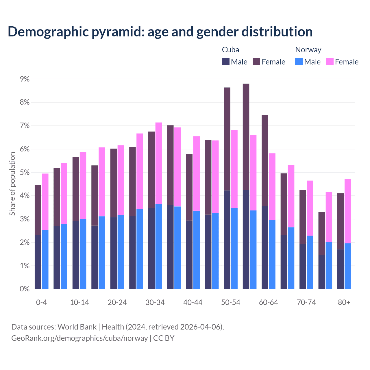 - The share of old-age demographic (65+) in Cuba is 16.6% vs 18.8% in Norway.