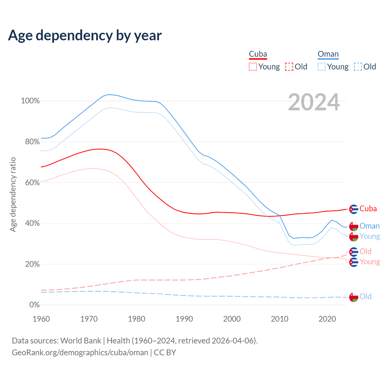 - Cuba is ranked 27/196 by median age (oldest to youngest) vs 101/196 for Oman.