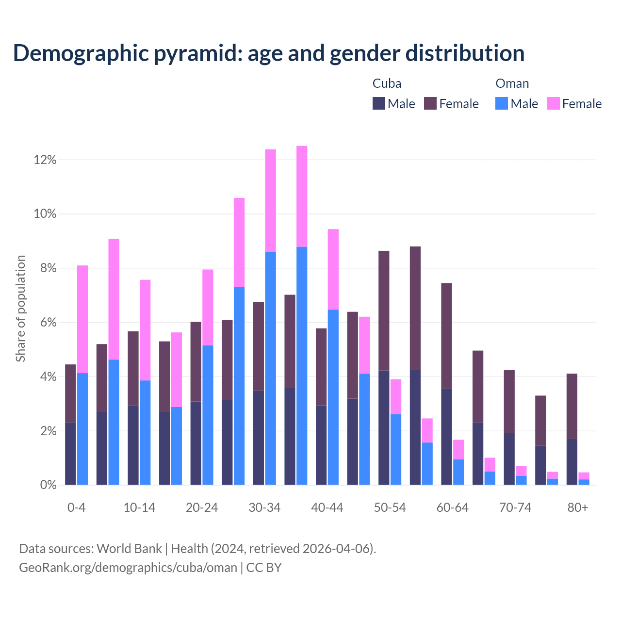 - The share of old-age demographic (65+) in Cuba is 16.6% vs 2.64% in Oman.