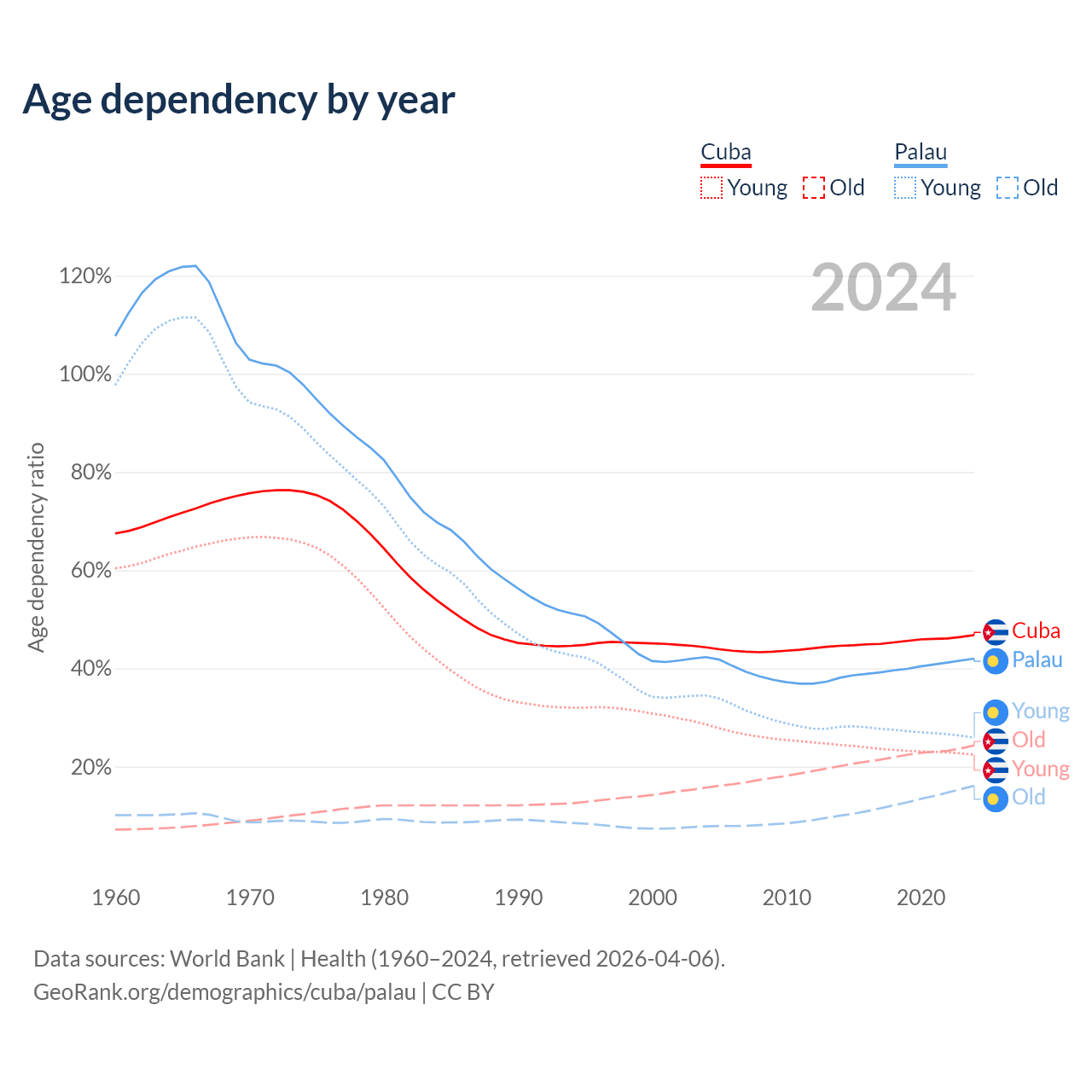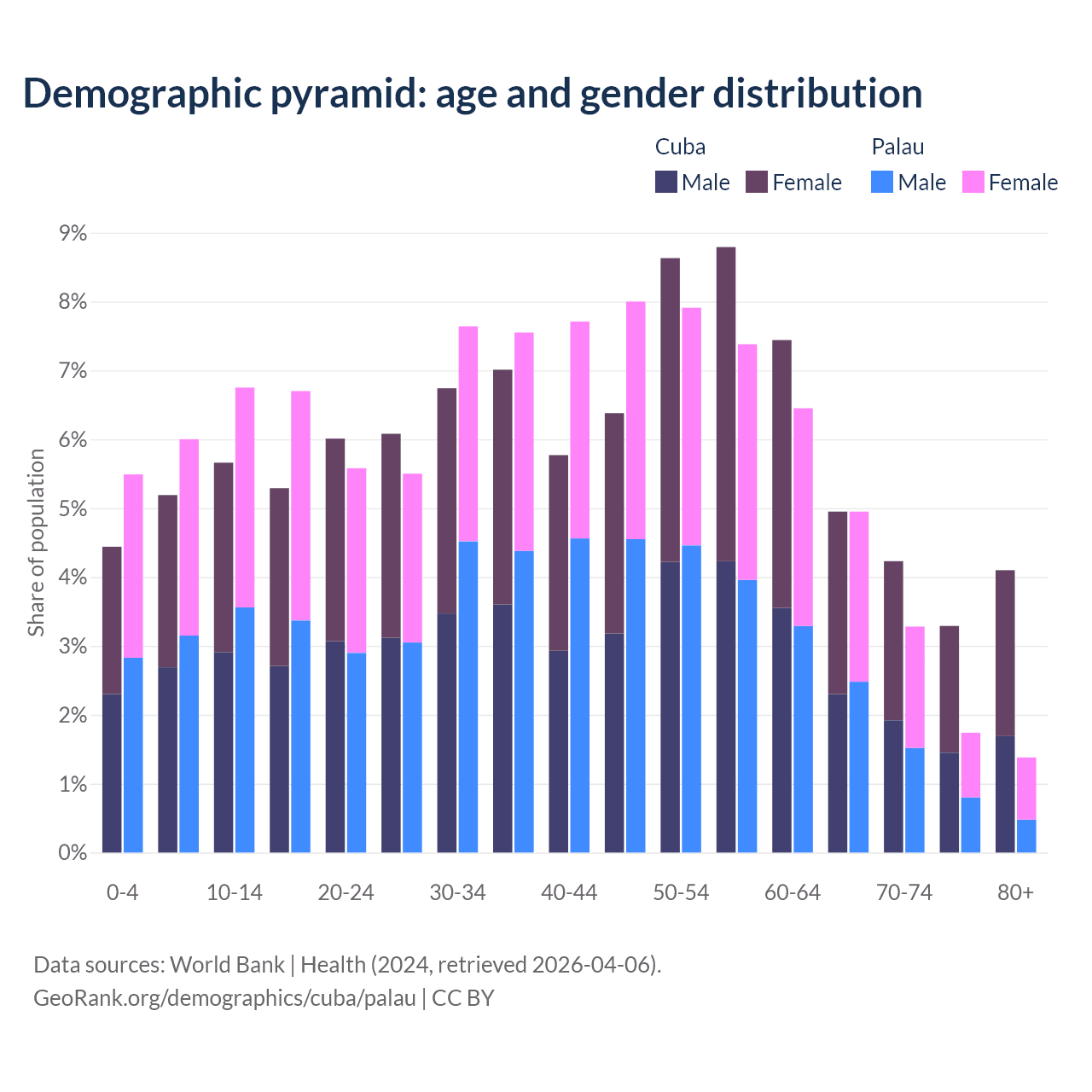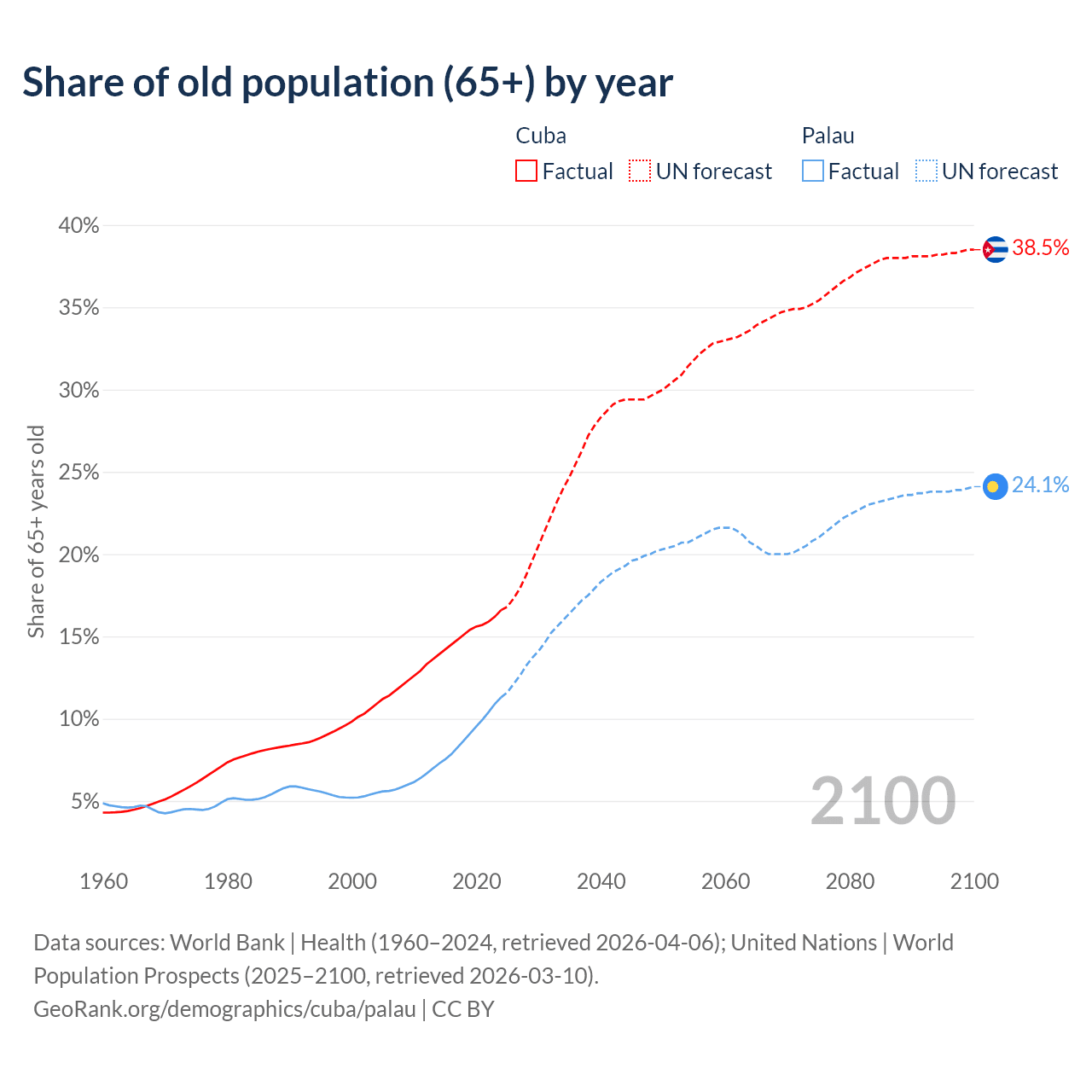 - The share of old-age demographic (65+) in Cuba is 16.6% vs 11.3% in Palau.