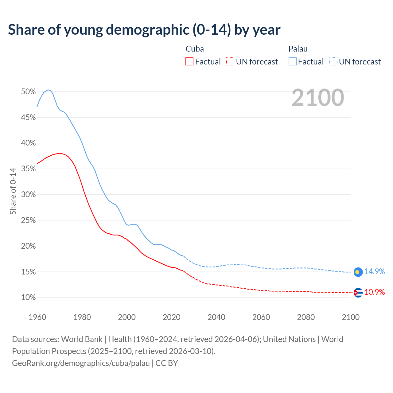 - The share of young demographic (0-15 years old) in Cuba is 15.3% vs 18.2% in Palau.