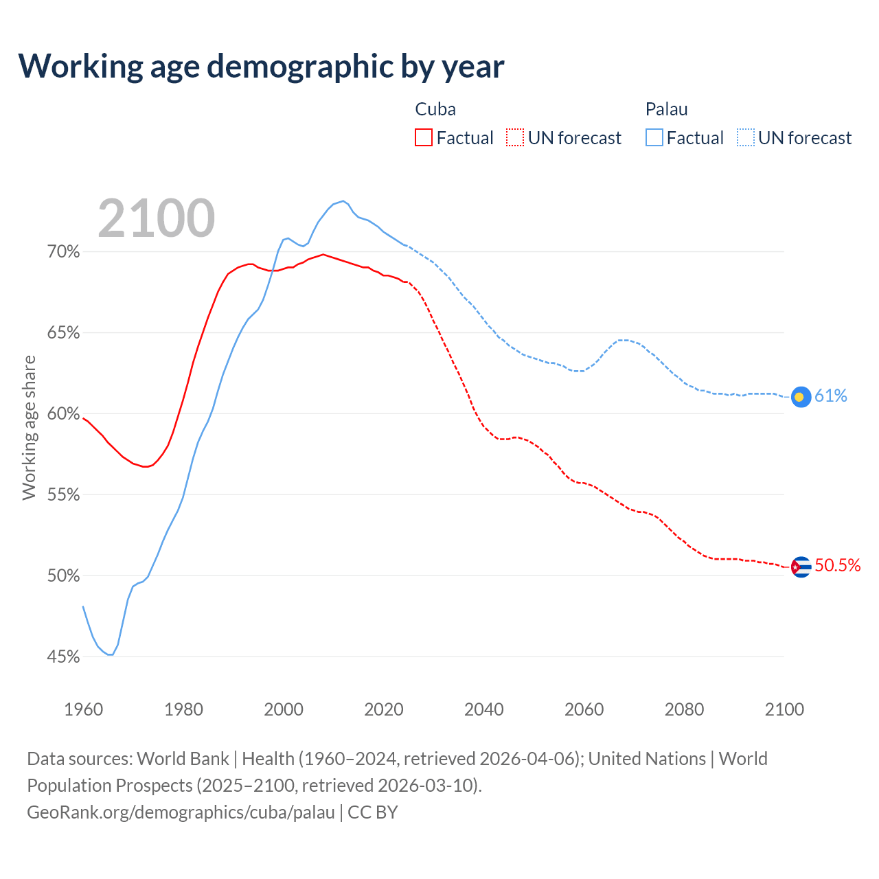 - Cuba has 7.42M working age adults (aged 15-64) vs 12.4K in Palau.
