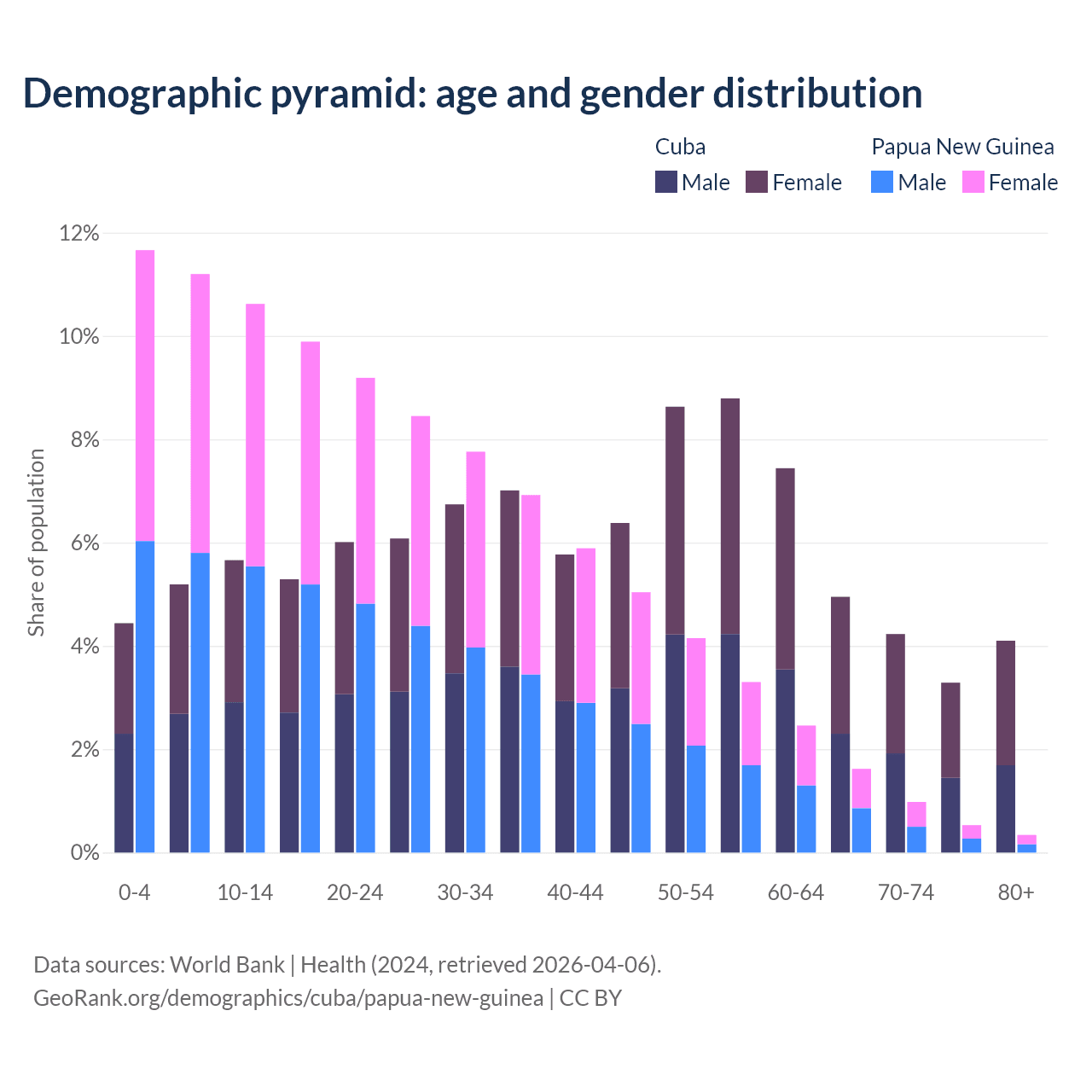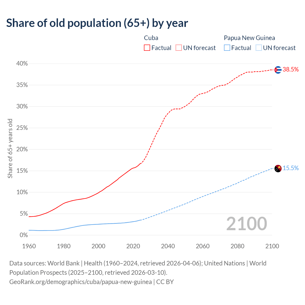 - The share of old-age demographic (65+) in Cuba is 16.6% vs 3.46% in Papua New Guinea.