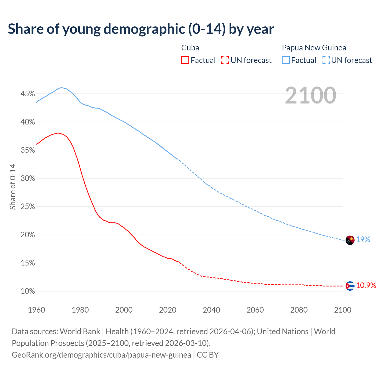 - The share of young demographic (0-15 years old) in Cuba is 15.3% vs 33.5% in Papua New Guinea.