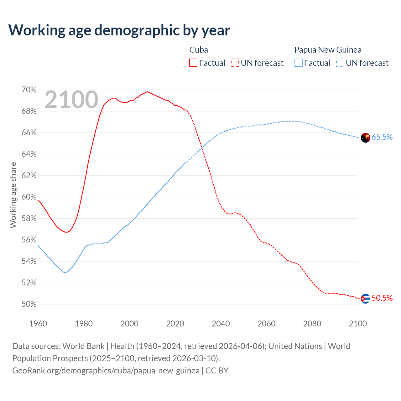 - Cuba has 7.42M working age adults (aged 15-64) vs 6.94M in Papua New Guinea.