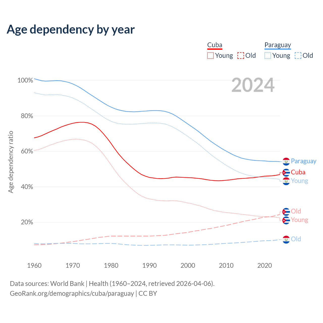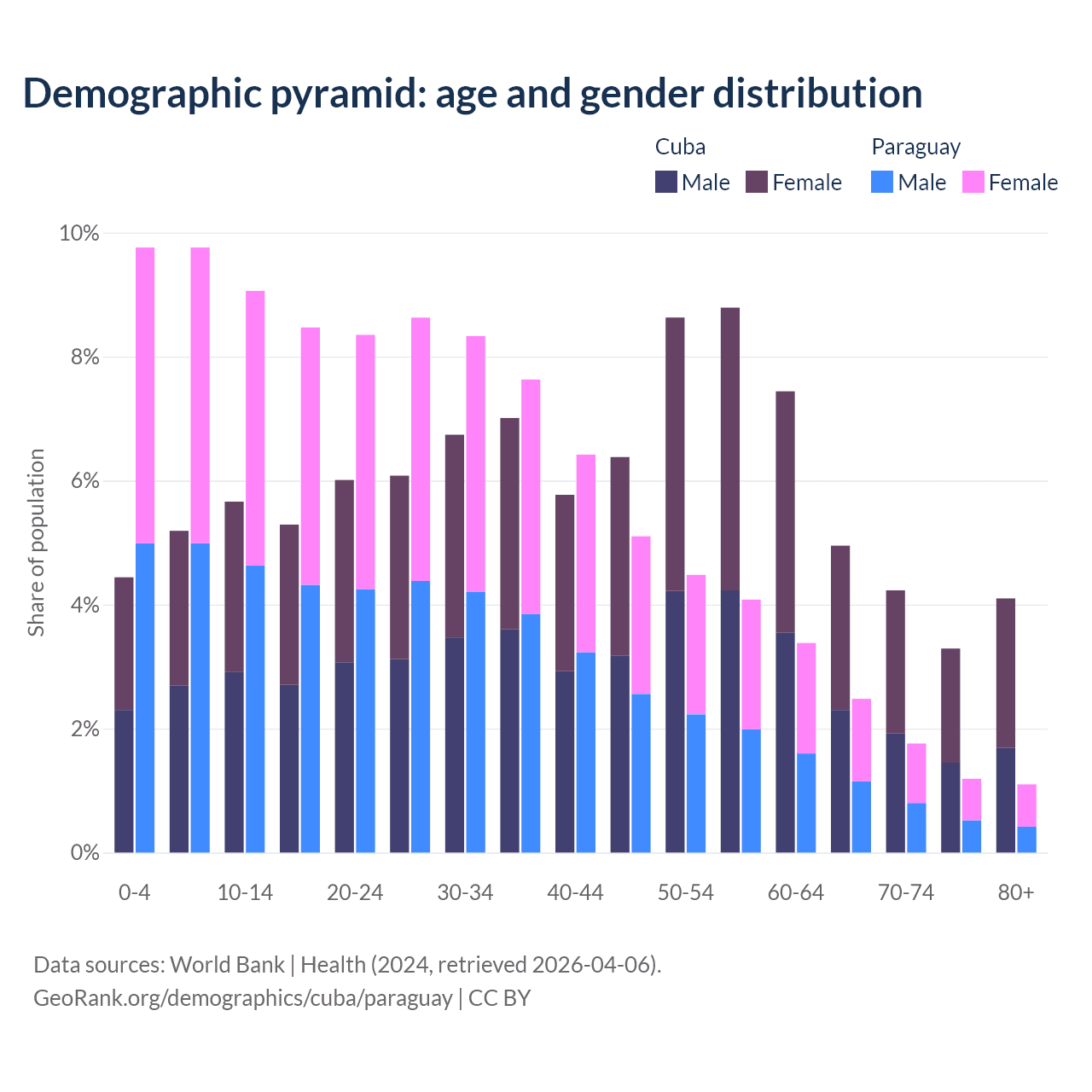 - Cuba is ranked 27/196 by median age (oldest to youngest) vs 118/196 for Paraguay.