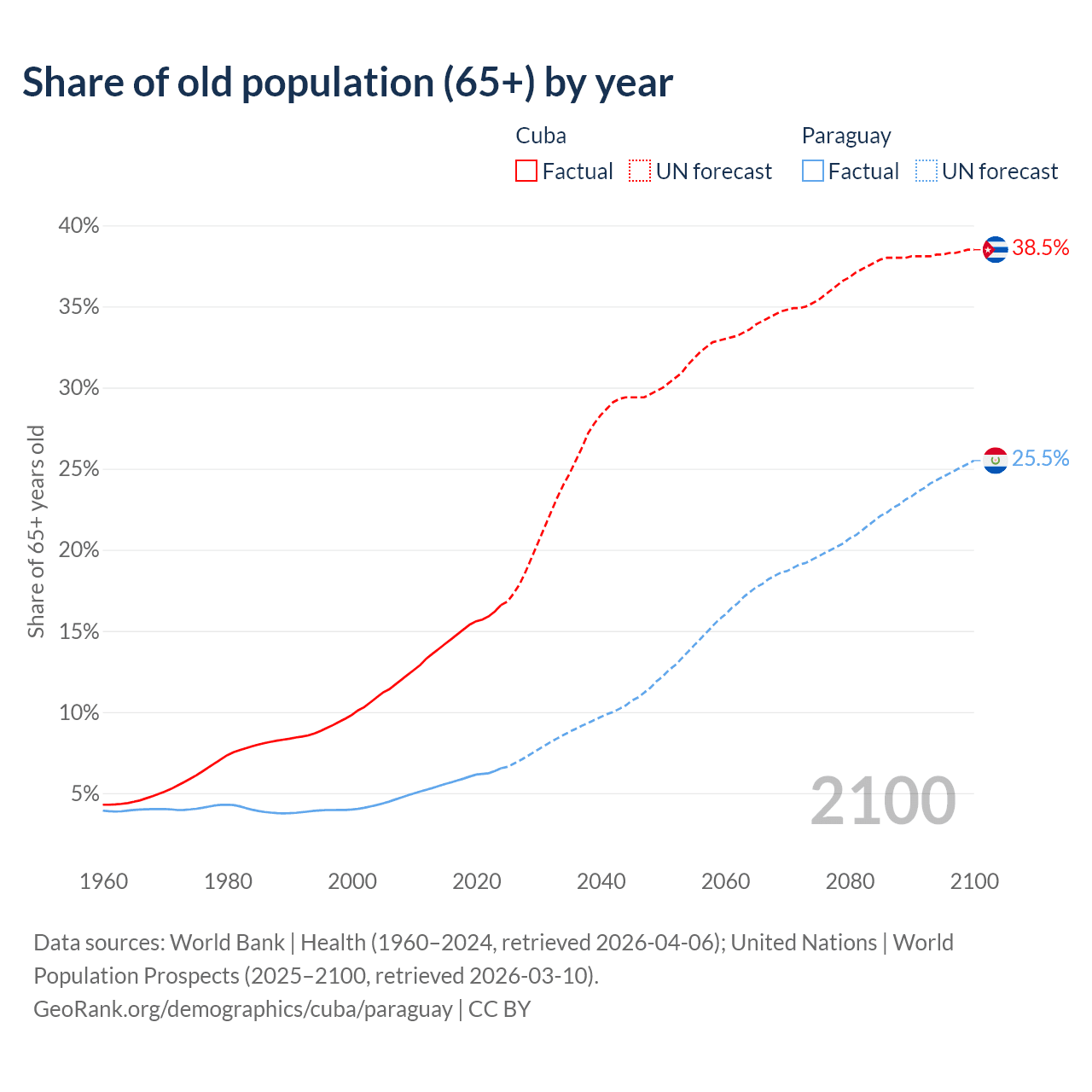 - The share of old-age demographic (65+) in Cuba is 16.6% vs 6.54% in Paraguay.
