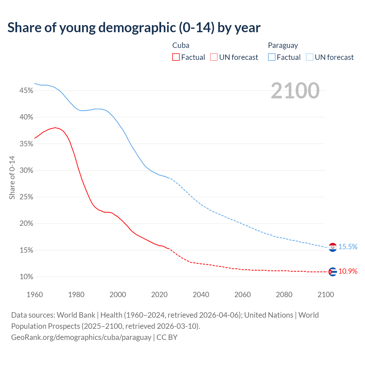- The share of young demographic (0-15 years old) in Cuba is 15.3% vs 28.6% in Paraguay.
