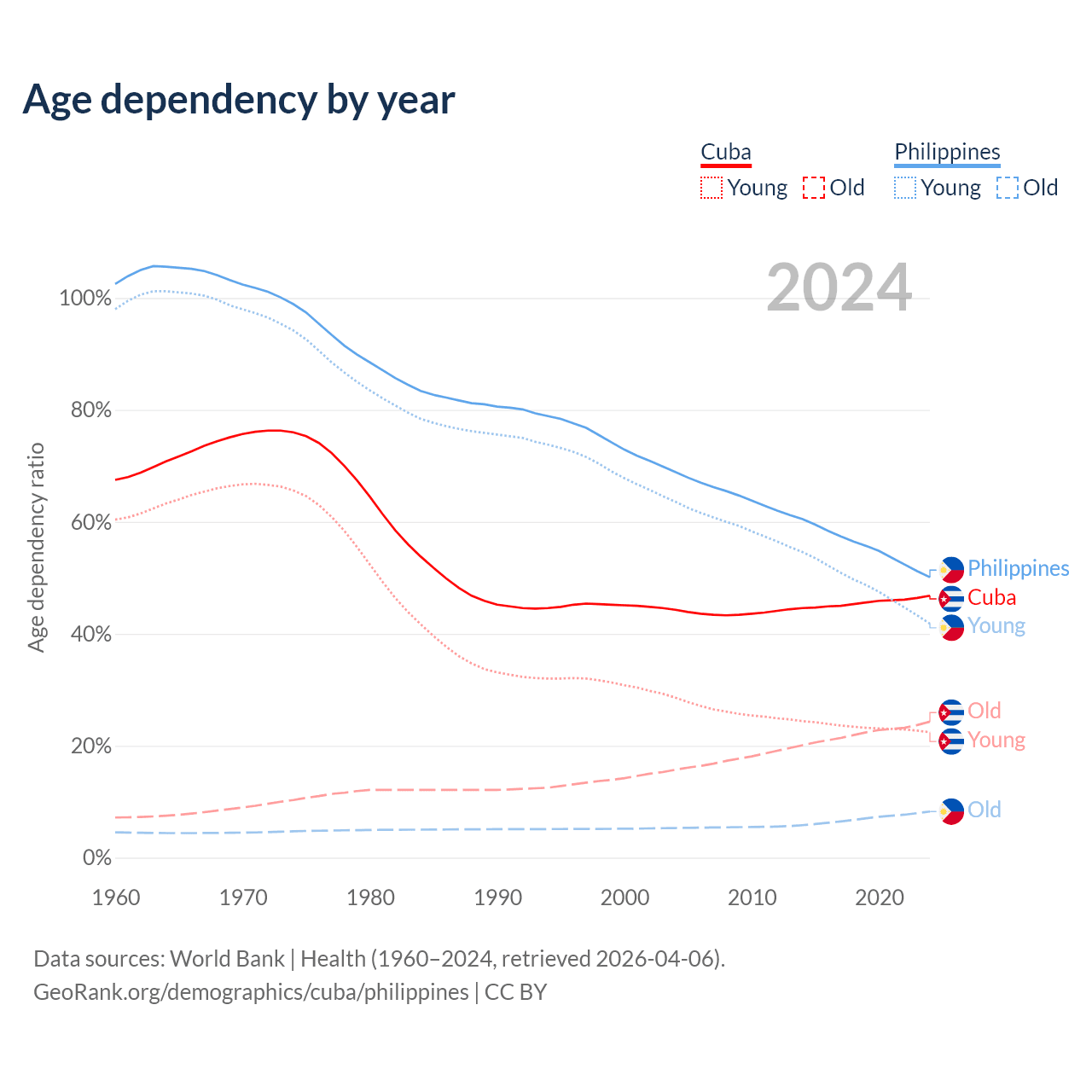 Data sources: World Bank | Health (1960–2024, retrieved 2026-04-06); U.S. Census Bureau (1960–2024, retrieved 2026-02-08).