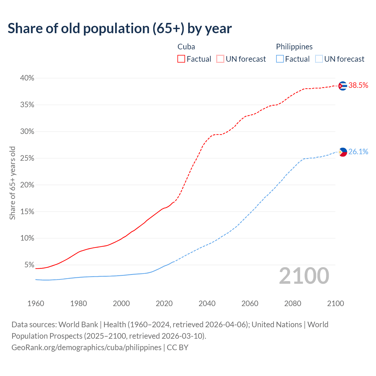 - The share of old-age demographic (65+) in Cuba is 16.6% vs 5.49% in the Philippines.