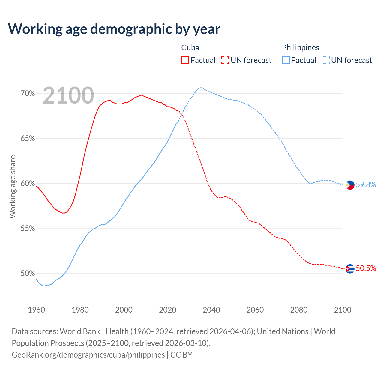 Median age Cuba vs Philippines, 1960-2100