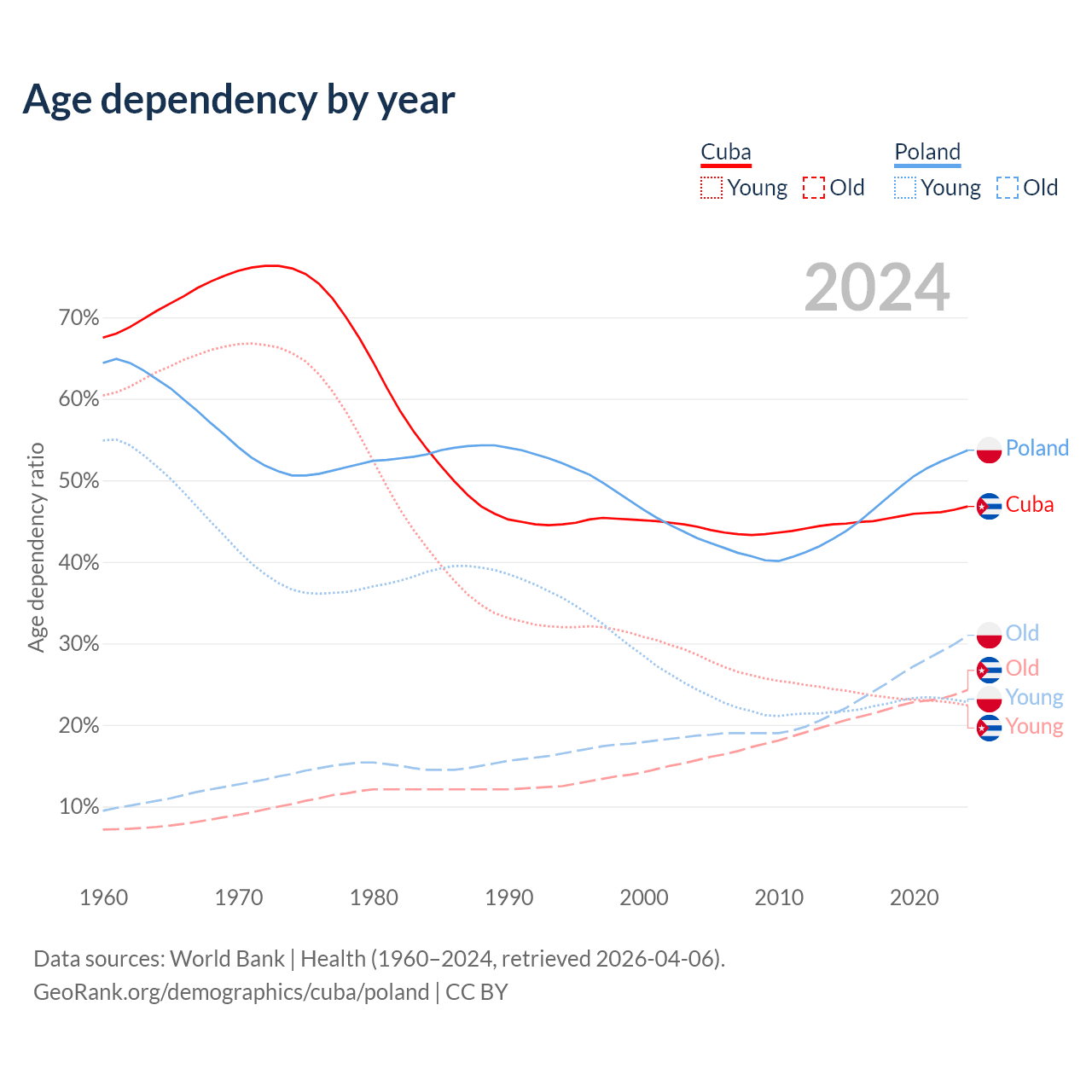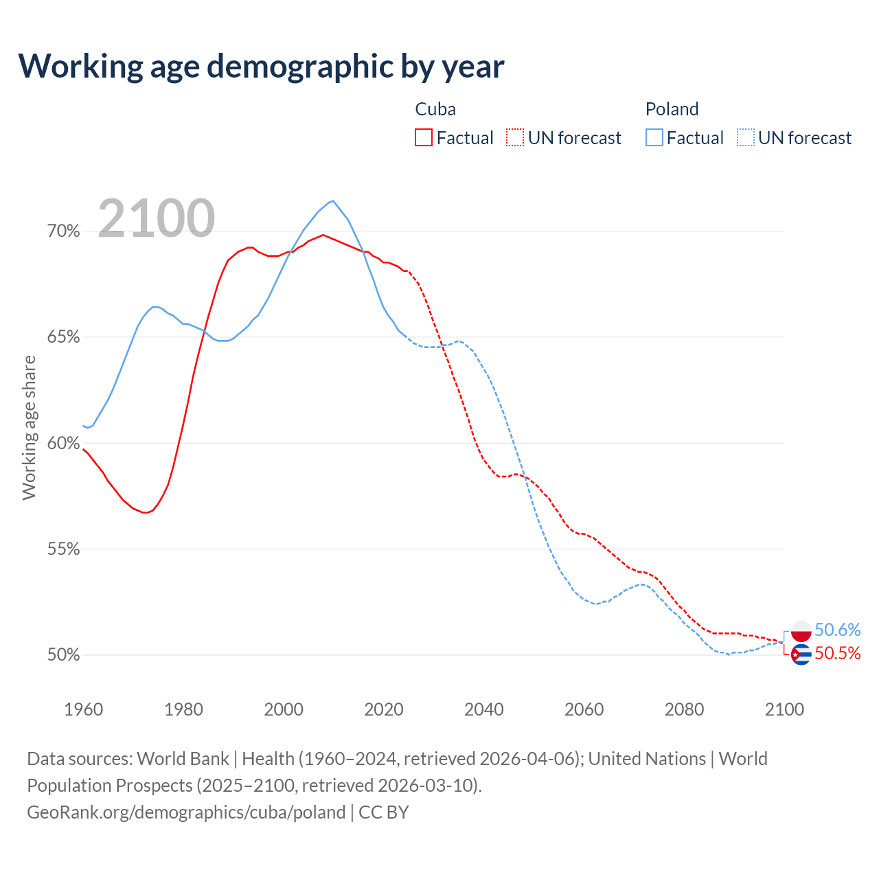 The share of older people aged 65 and over is 16.6% in Cuba and 20.1% in Poland. Life expectancy in Cuba compared to Poland .