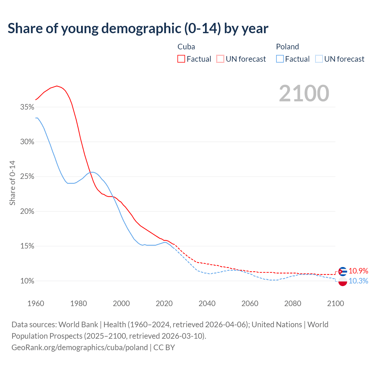 - The share of young demographic (0-15 years old) in Cuba is 15.3% vs 14.8% in Poland.