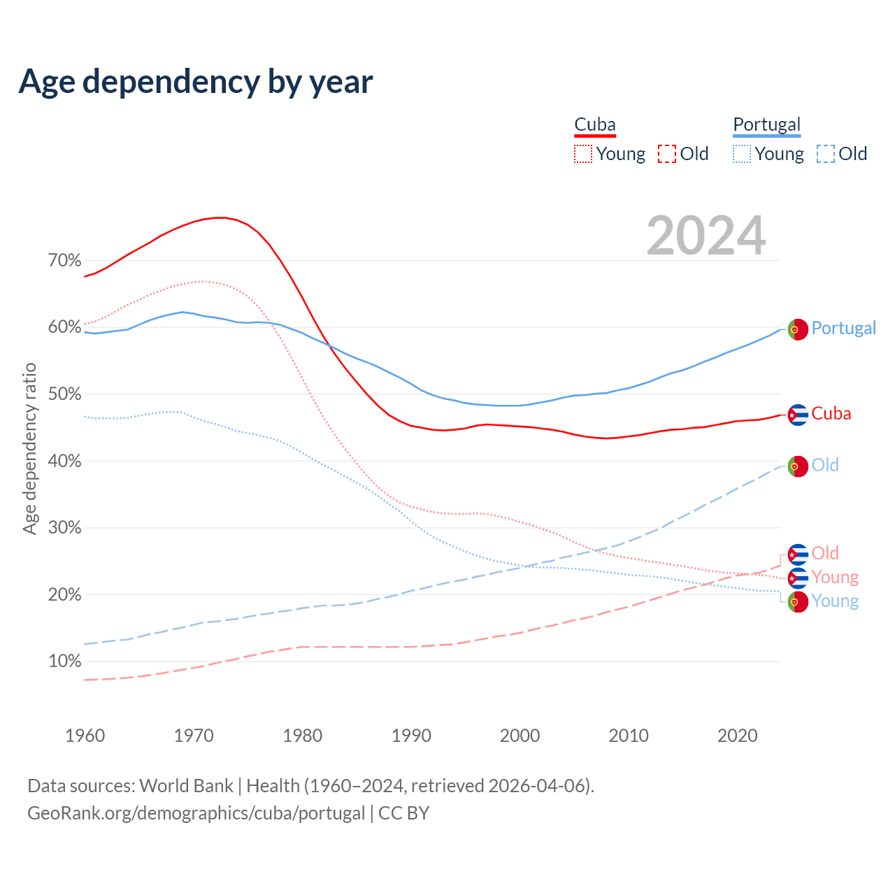 - Cuba is ranked 27/196 by median age (oldest to youngest) vs 5/196 for Portugal.