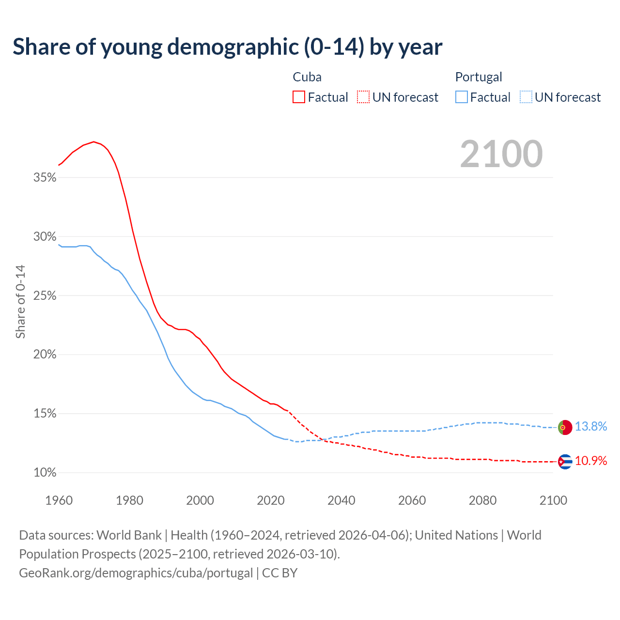 - The share of young demographic (0-15 years old) in Cuba is 15.3% vs 12.8% in Portugal.