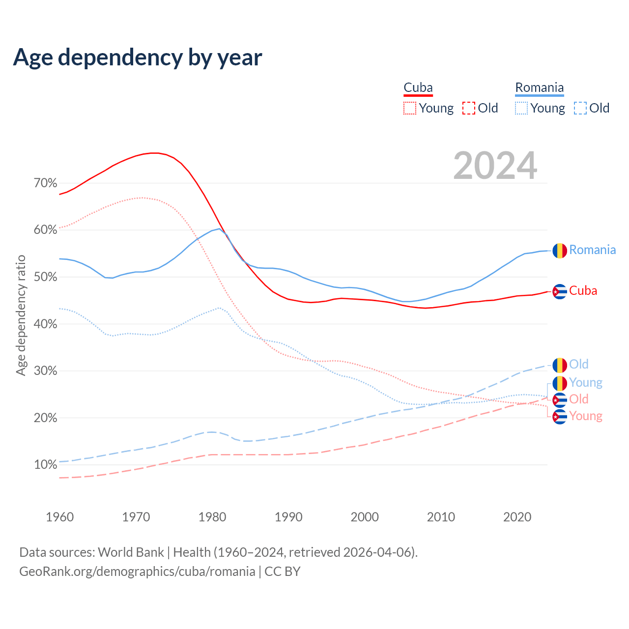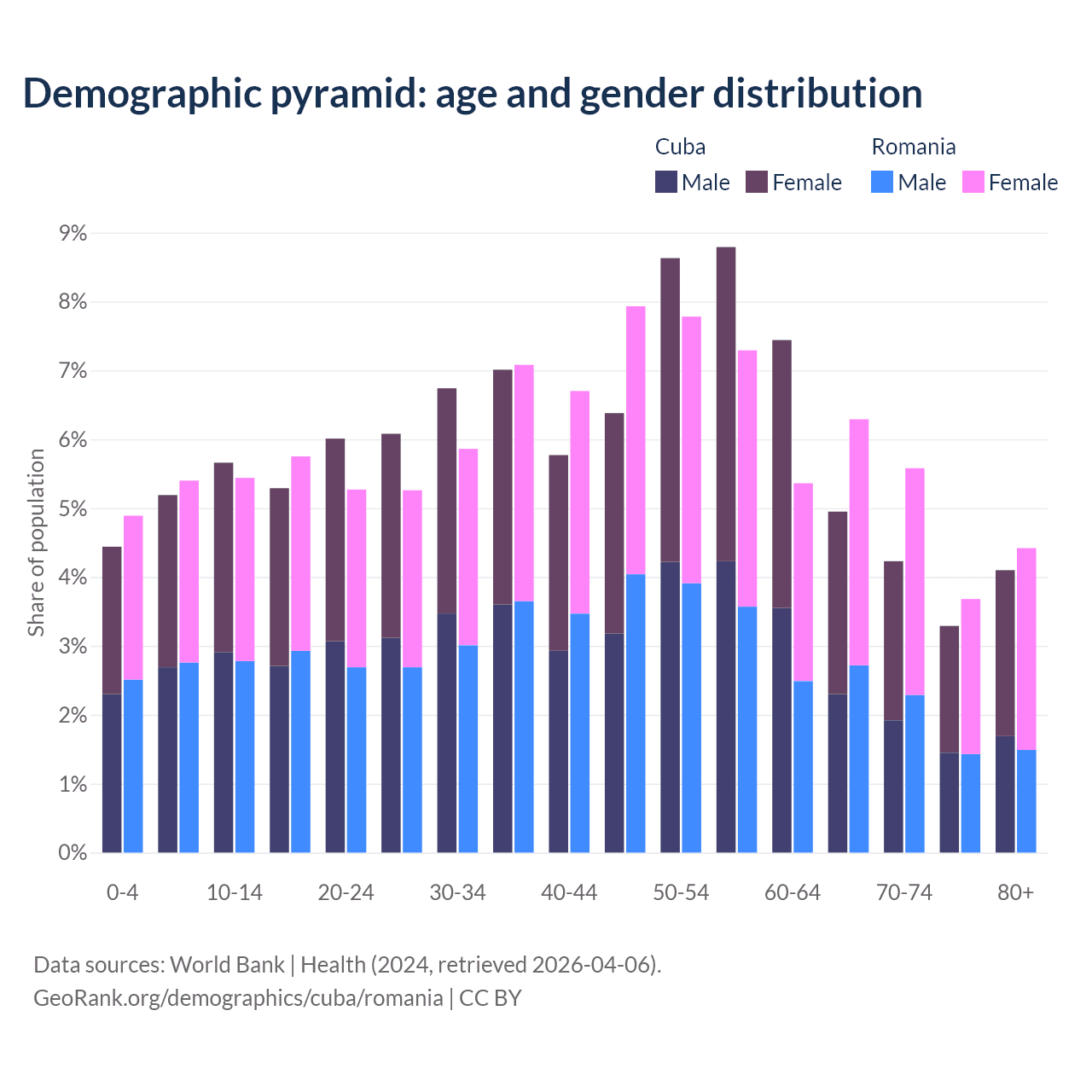 - Cuba is ranked 27/196 by median age (oldest to youngest) vs 23/196 for Romania.