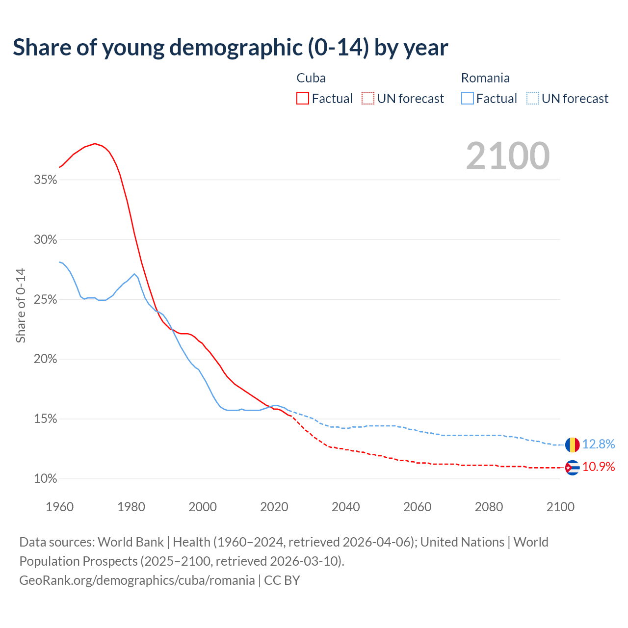 - The share of young demographic (0-15 years old) in Cuba is 15.3% vs 15.7% in Romania.