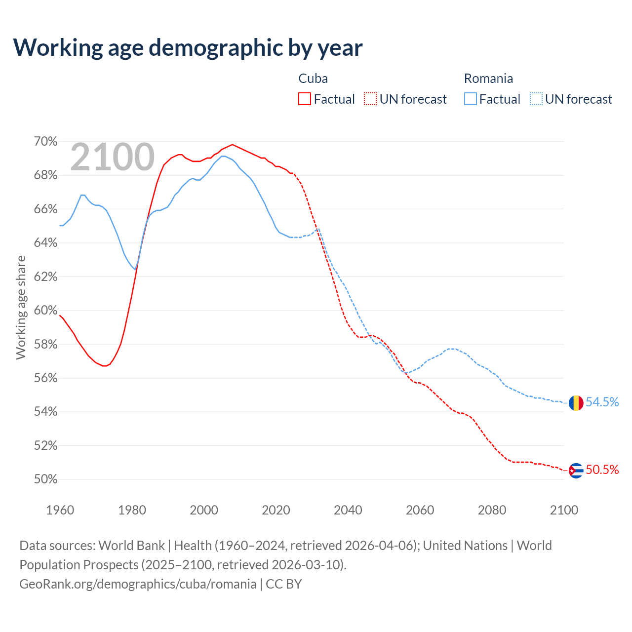 - Cuba has 7.42M working age adults (aged 15-64) vs 12.1M in Romania.