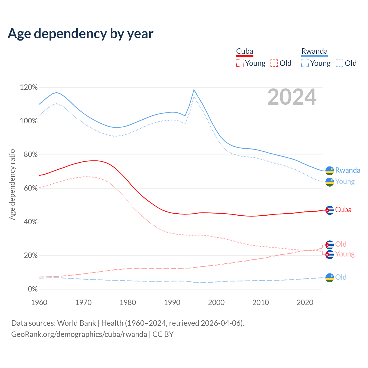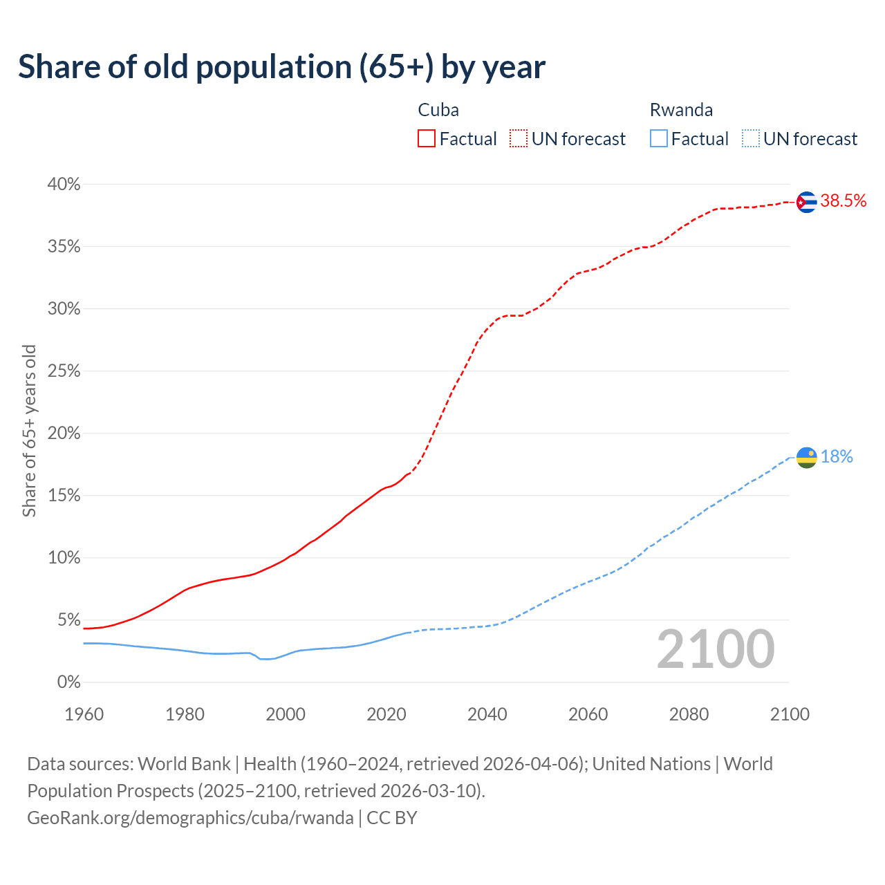 - The share of old-age demographic (65+) in Cuba is 16.6% vs 3.93% in Rwanda.