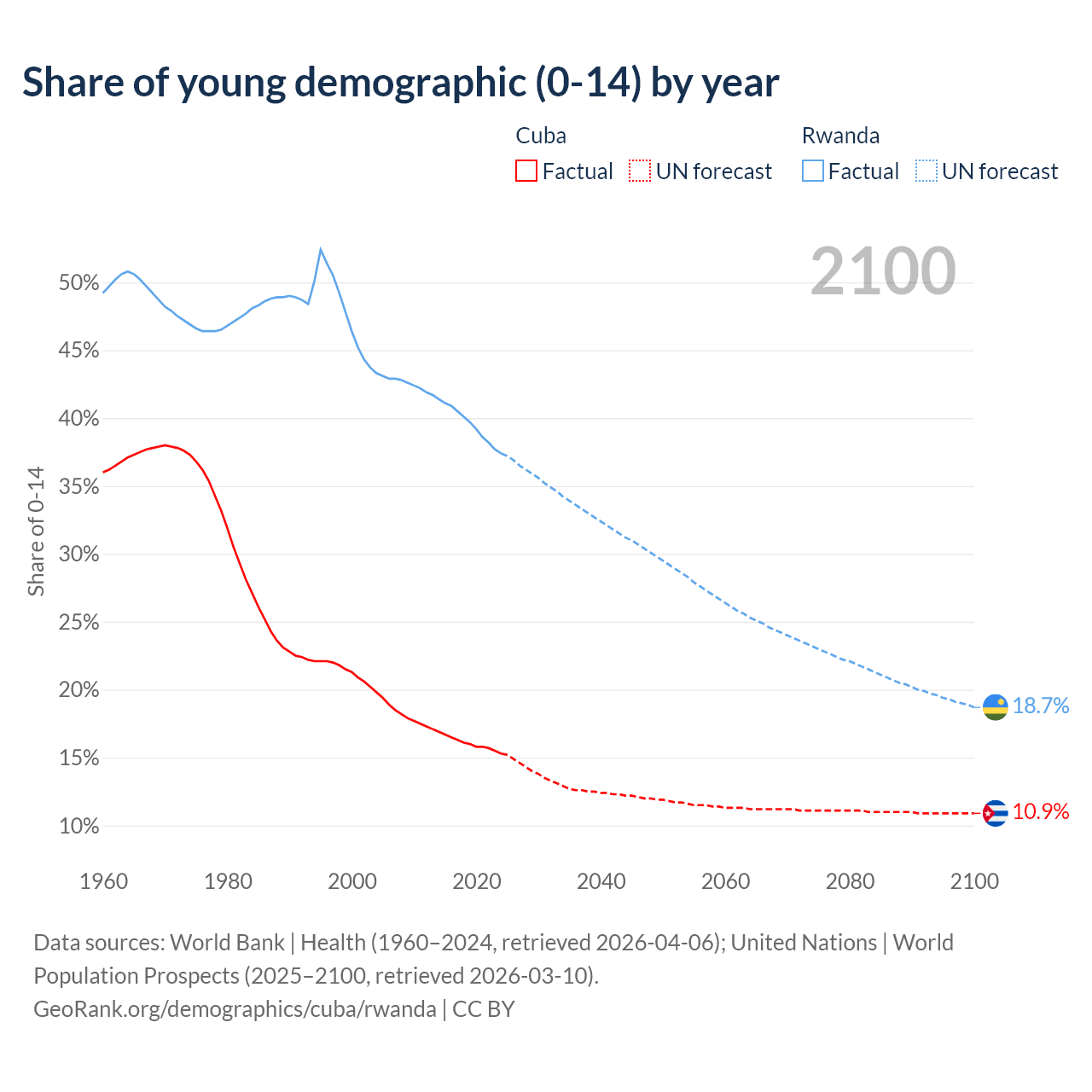 - The share of young demographic (0-15 years old) in Cuba is 15.3% vs 37.4% in Rwanda.