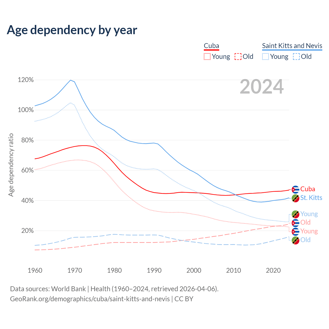 Data sources: World Bank | Health (1960–2024, retrieved 2026-04-06); U.S. Census Bureau (1960–2024, retrieved 2026-02-08).