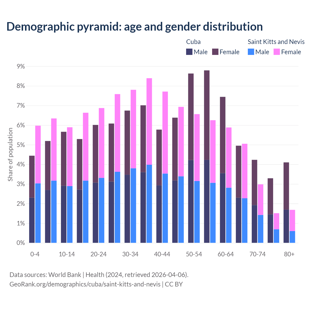 - The share of old-age demographic (65+) in Cuba is 16.6% vs 11.2% in Saint Kitts and Nevis.