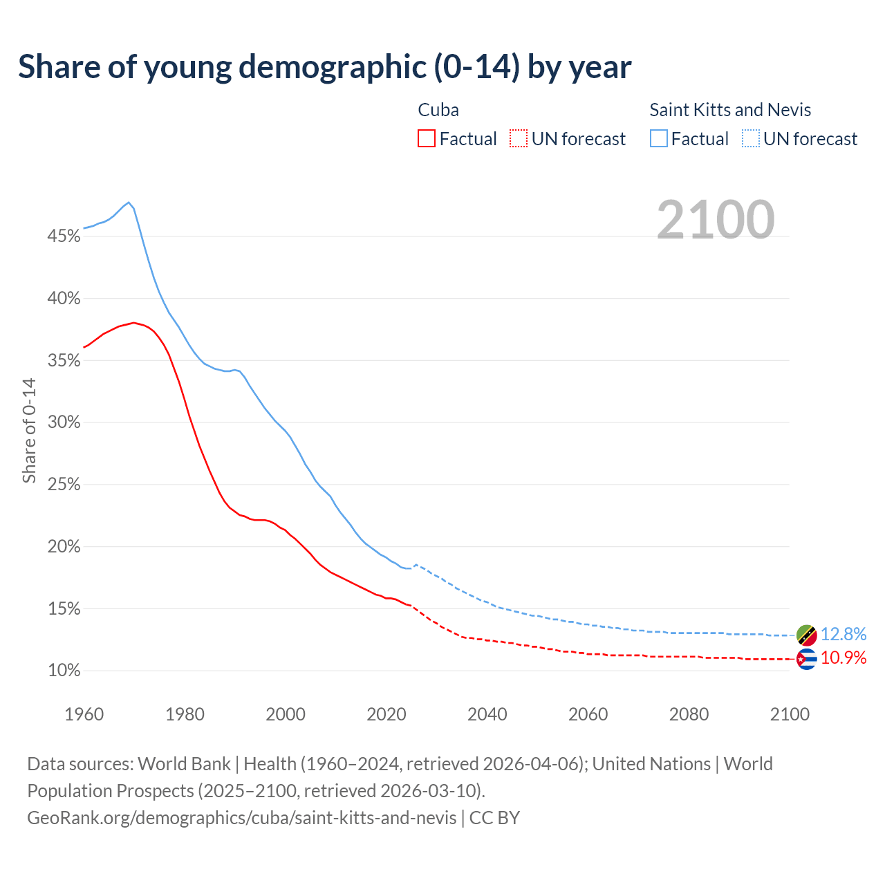 - The share of young demographic (0-15 years old) in Cuba is 15.3% vs 18.2% in Saint Kitts and Nevis.