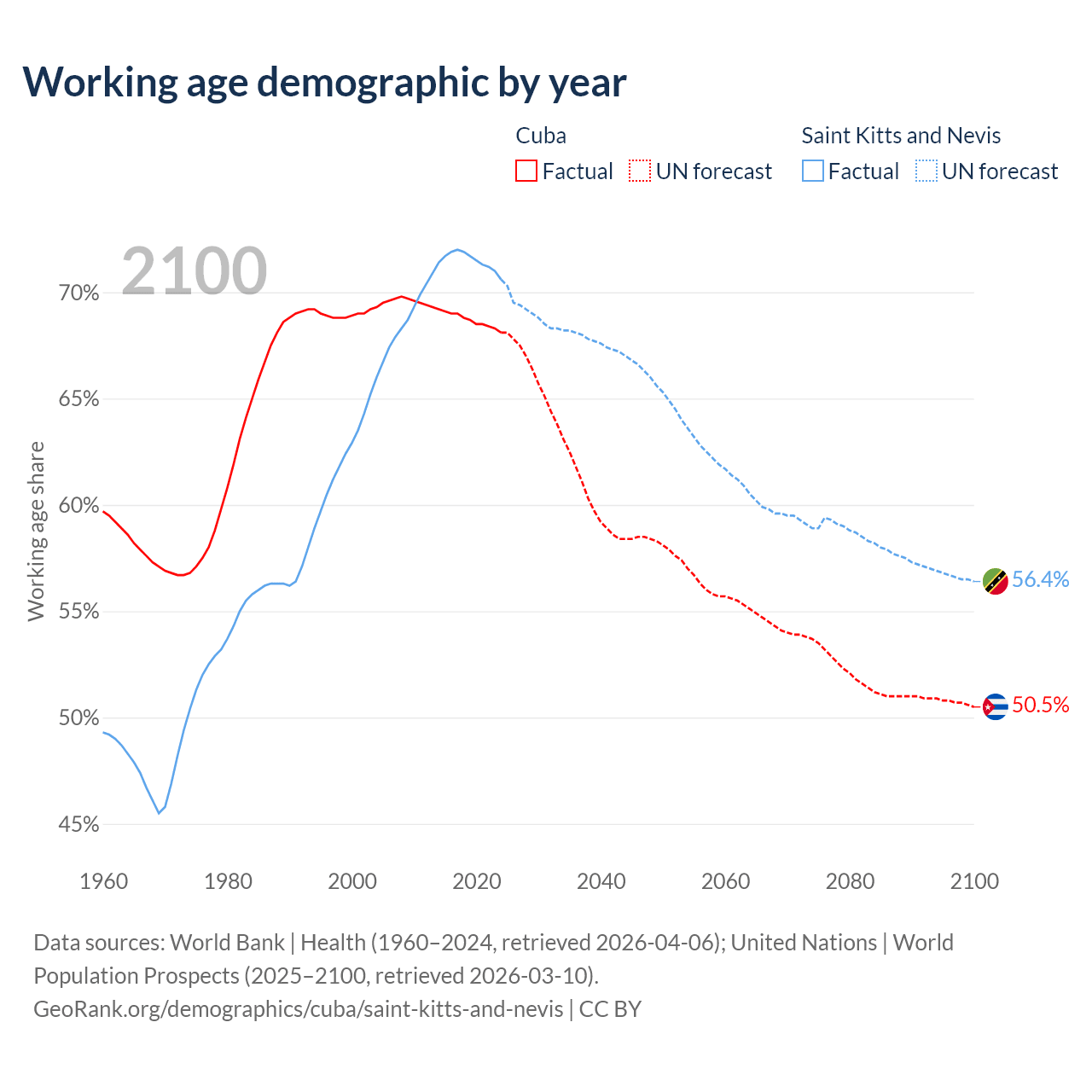 Median age Cuba vs Saint Kitts and Nevis, 1960-2100