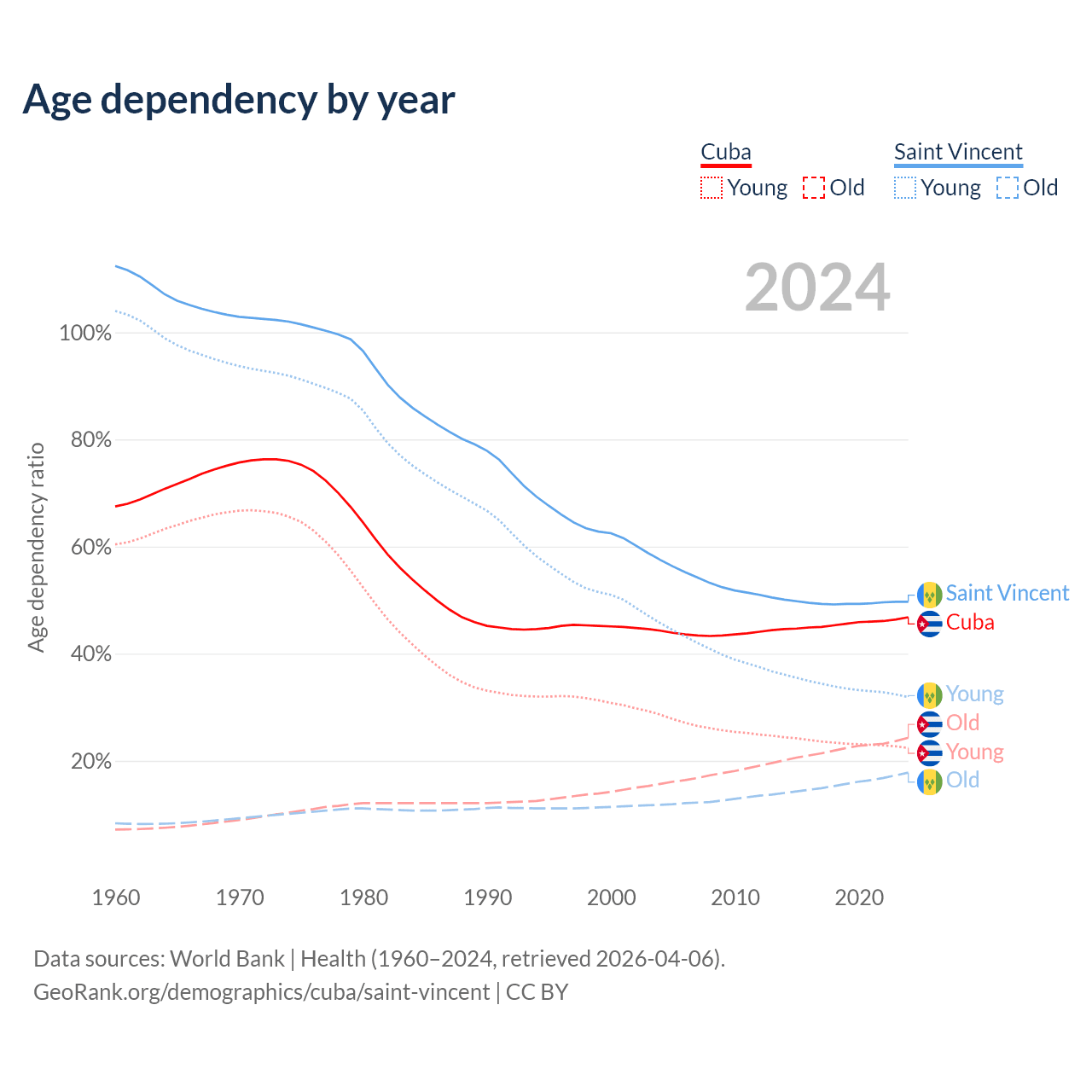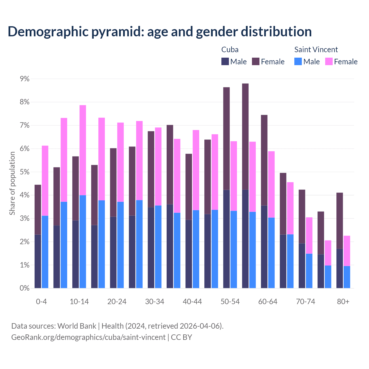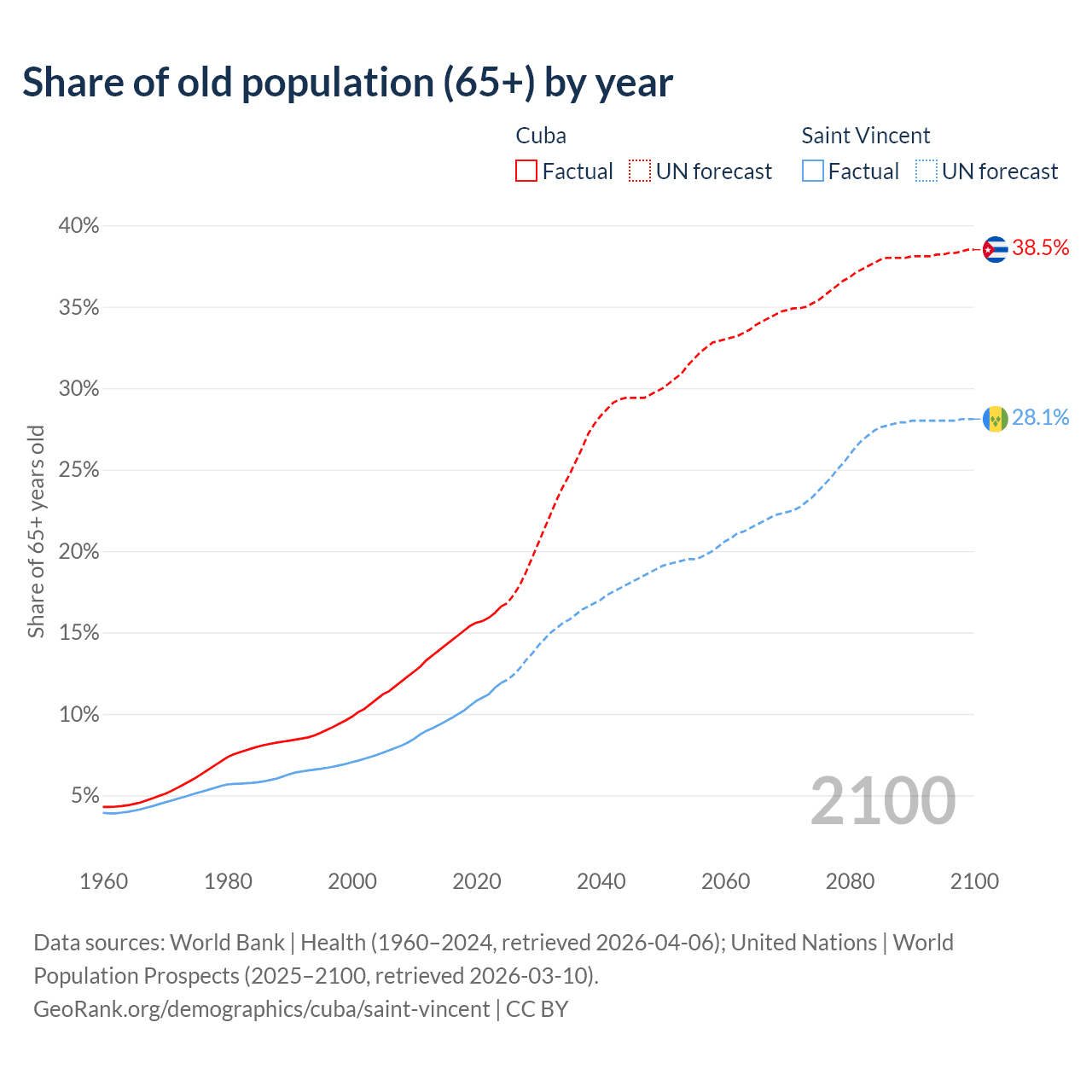 - The share of old-age demographic (65+) in Cuba is 16.6% vs 11.9% in Saint Vincent.