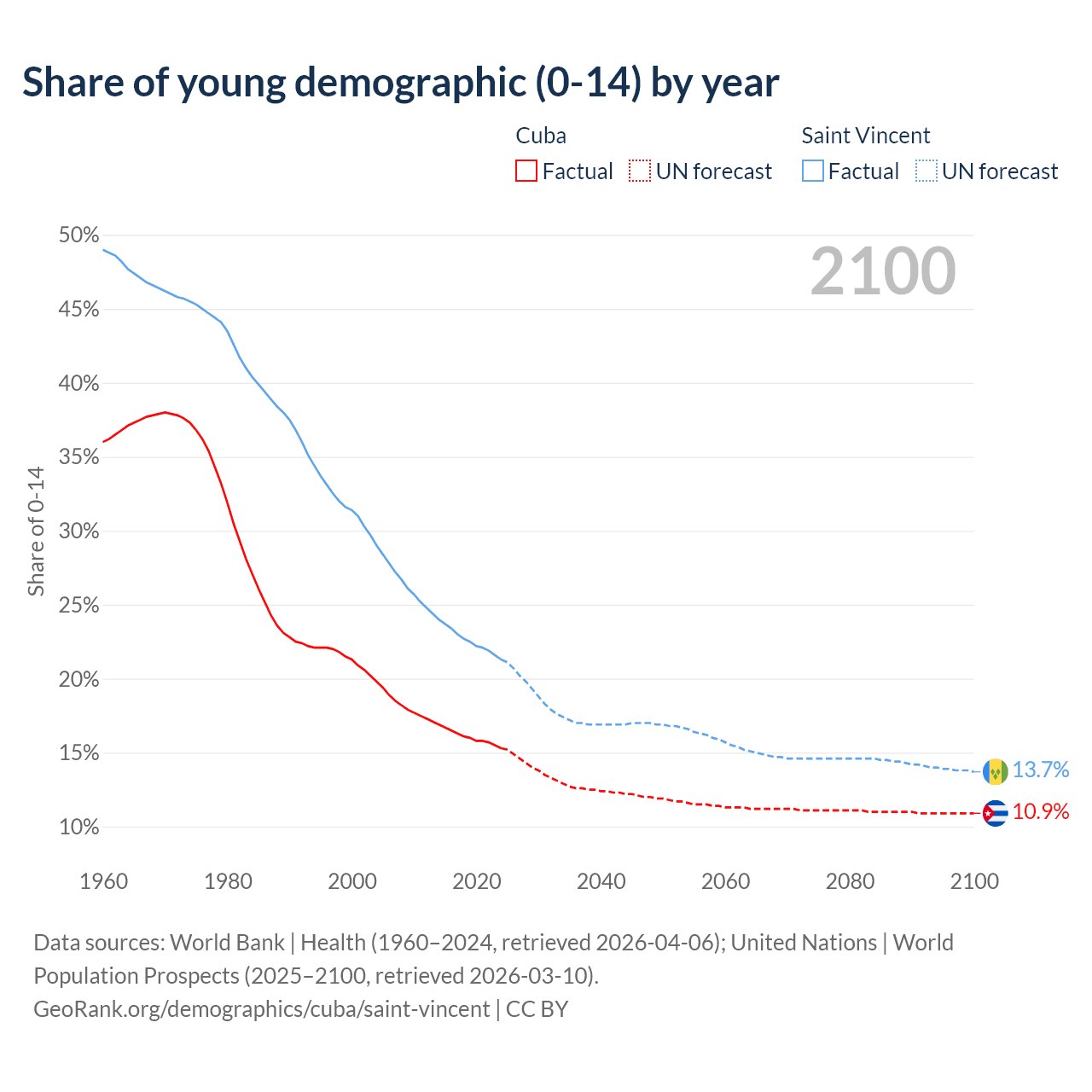 - The share of young demographic (0-15 years old) in Cuba is 15.3% vs 21.3% in Saint Vincent.