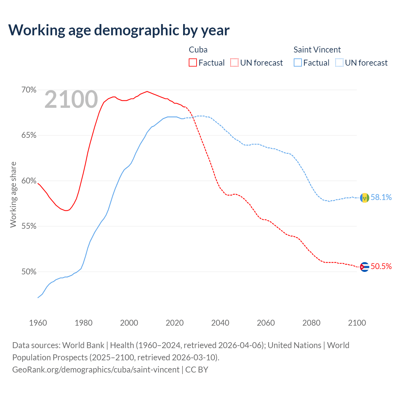 - Cuba has 7.42M working age adults (aged 15-64) vs 66.3K in Saint Vincent.