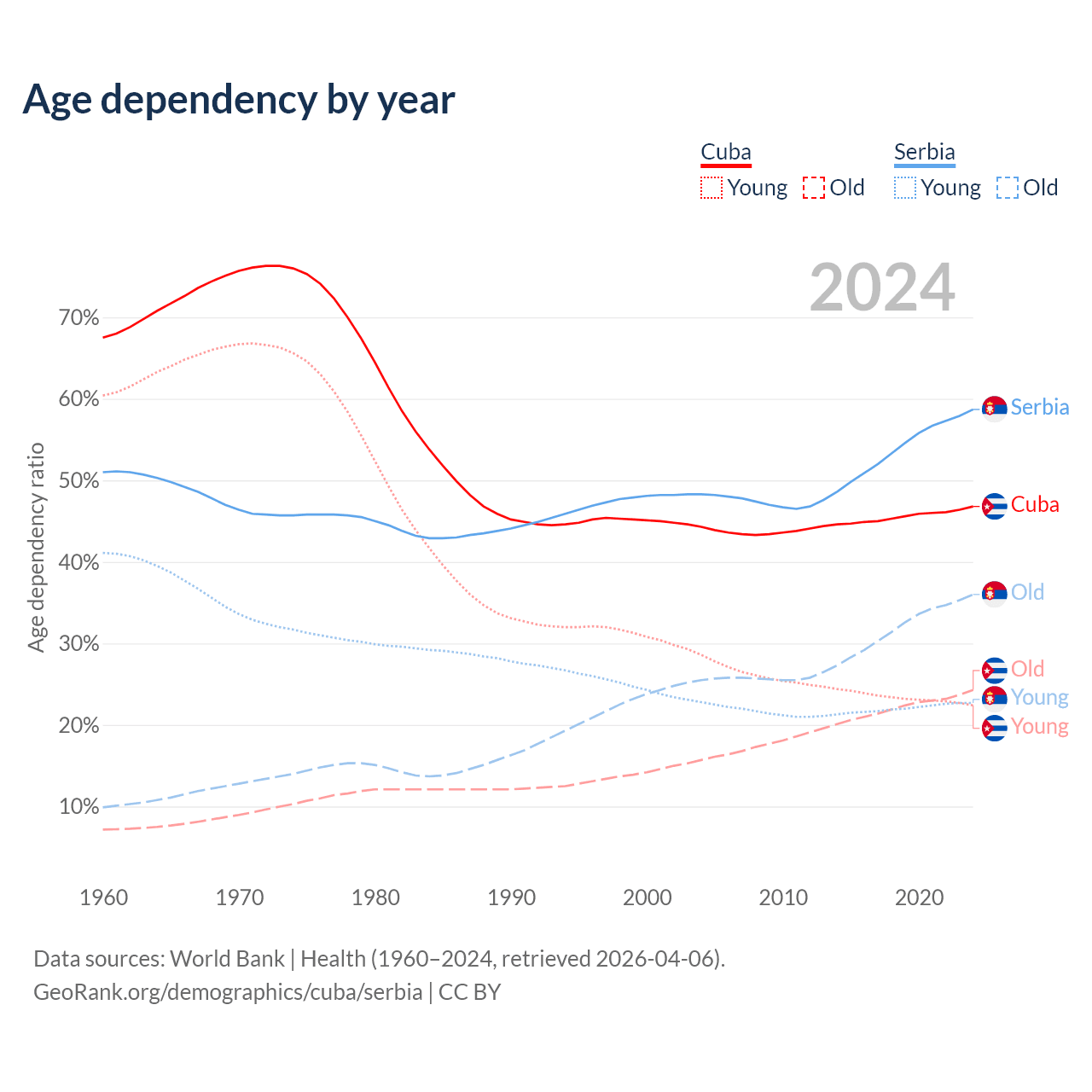 - Cuba is ranked 27/196 by median age (oldest to youngest) vs 15/196 for Serbia.