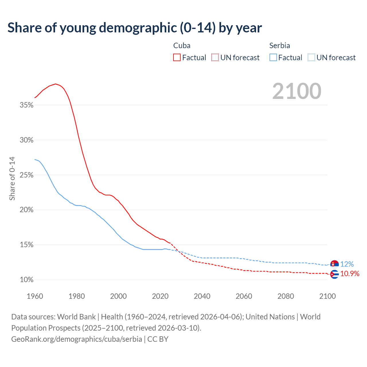 - The share of young demographic (0-15 years old) in Cuba is 15.3% vs 14.3% in Serbia.