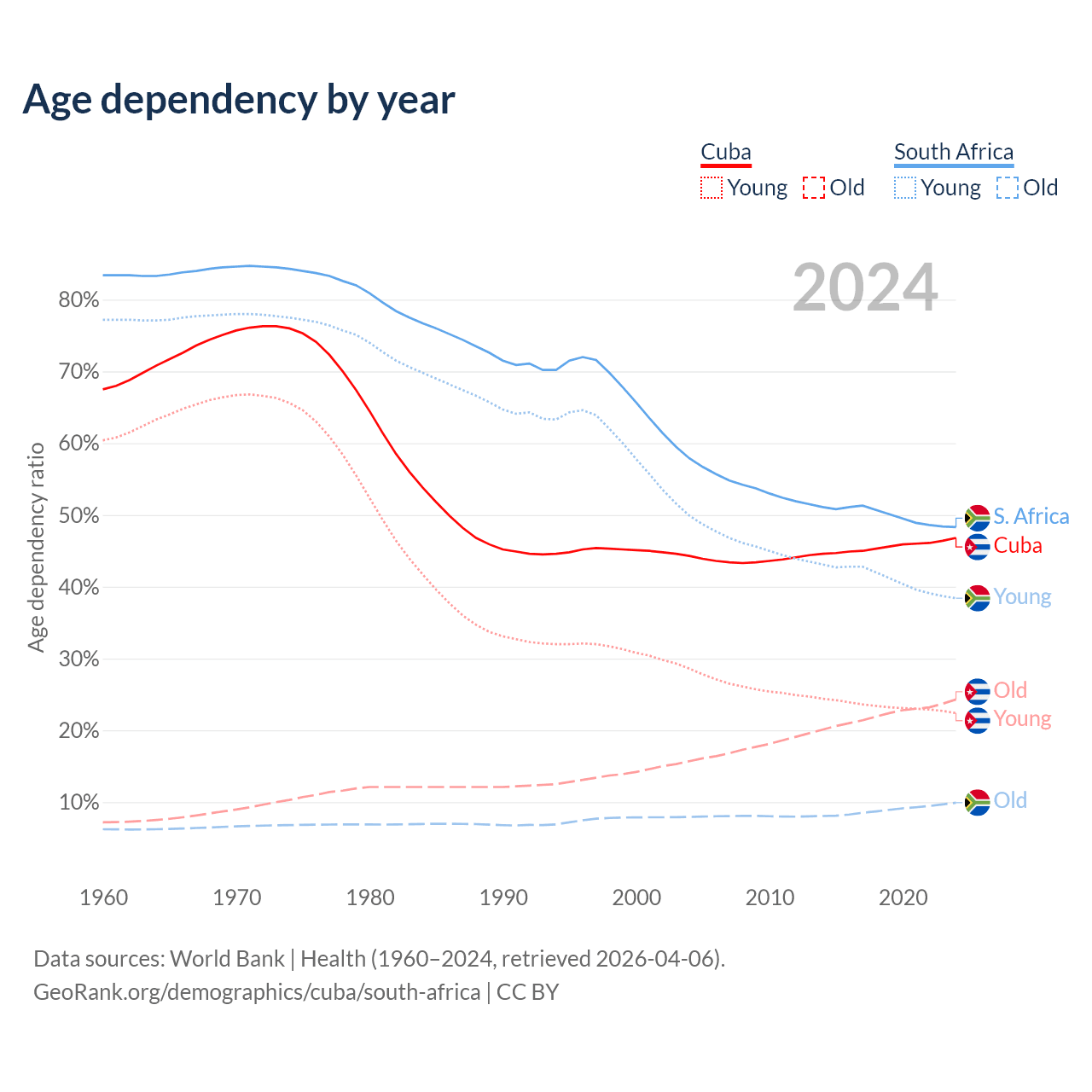 - Cuba is ranked 27/196 by median age (oldest to youngest) vs 107/196 for South Africa.