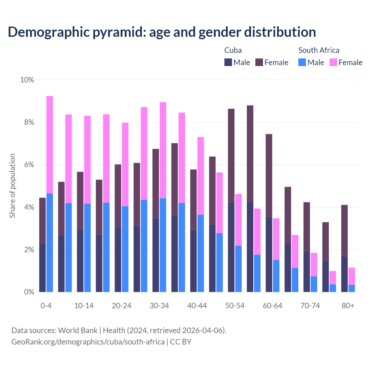 The share of older people aged 65 and over is 16.6% in Cuba and 6.69% in South Africa. Life expectancy in Cuba compared to South Africa .