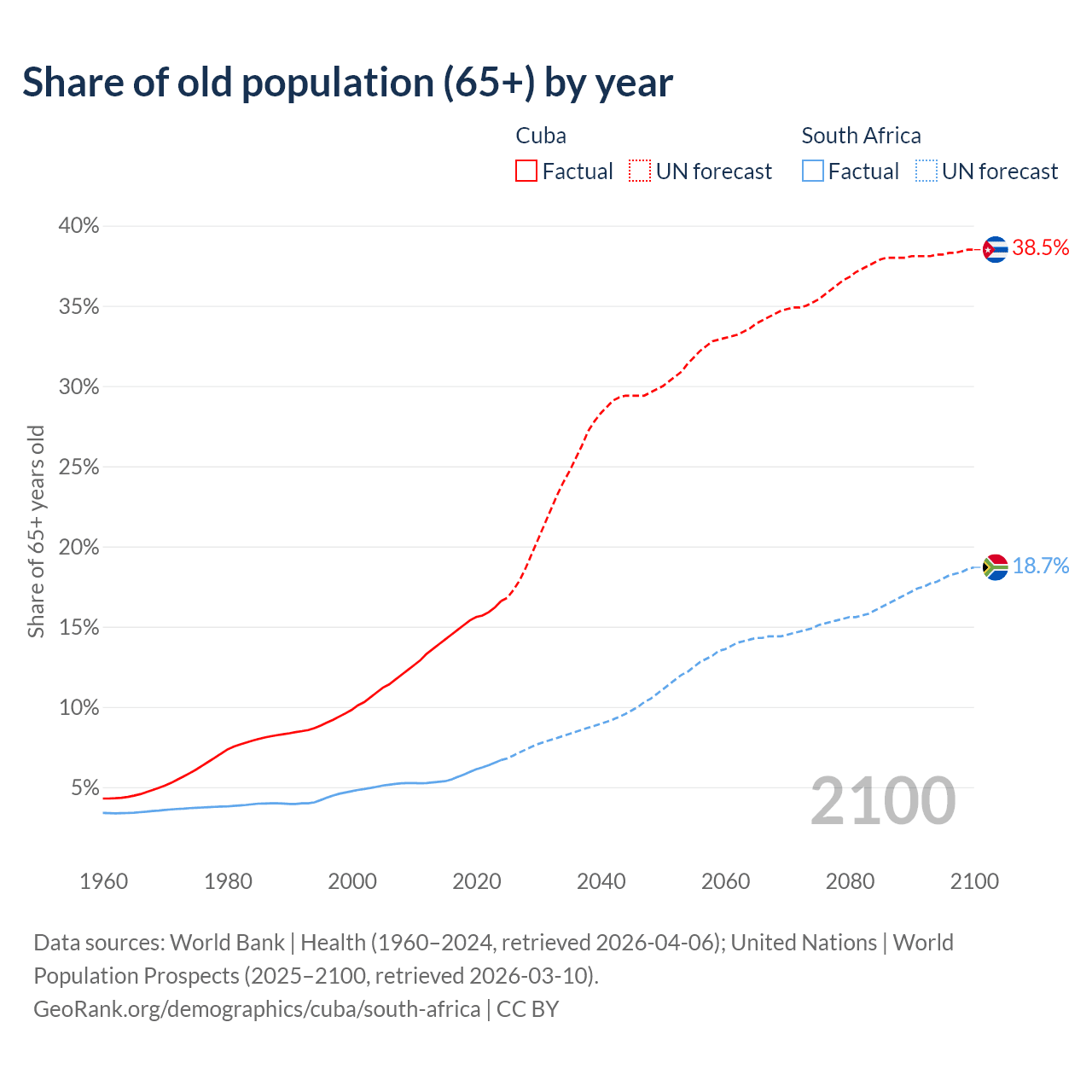 - The share of old-age demographic (65+) in Cuba is 16.6% vs 6.69% in South Africa.