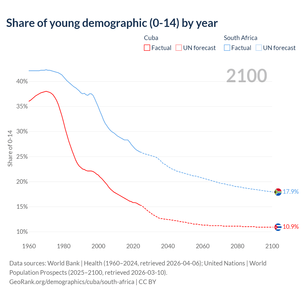 - The share of young demographic (0-15 years old) in Cuba is 15.3% vs 25.9% in South Africa.