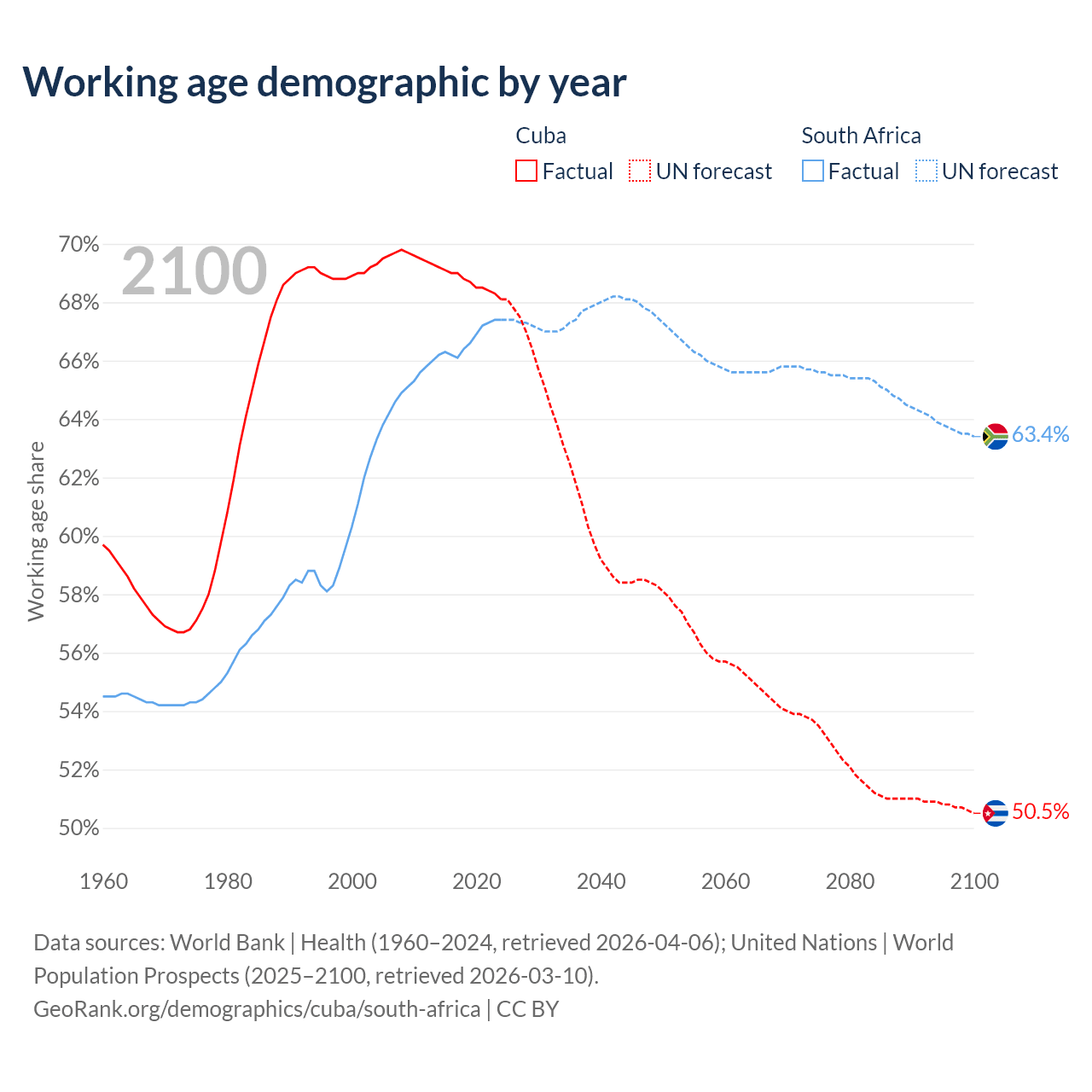 Median age Cuba vs South Africa, 1960-2100