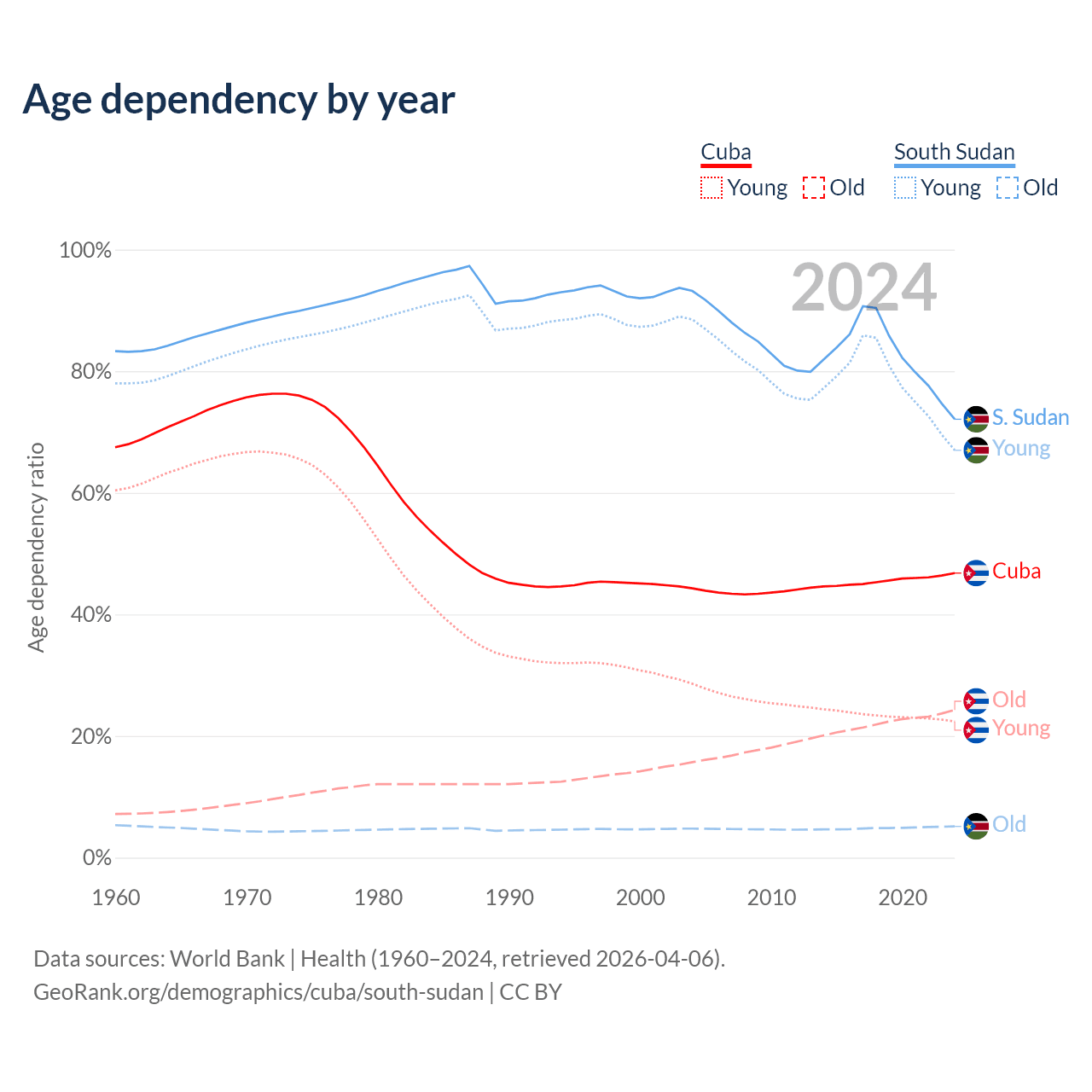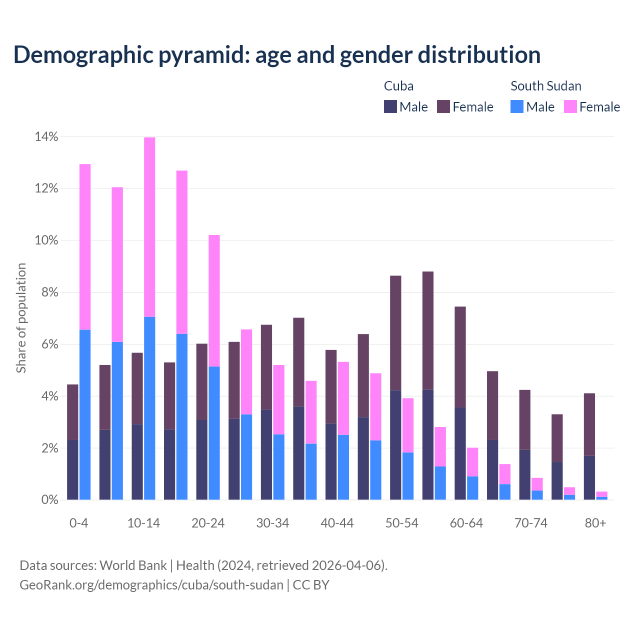 - Cuba is ranked 27/196 by median age (oldest to youngest) vs 173/196 for South Sudan.