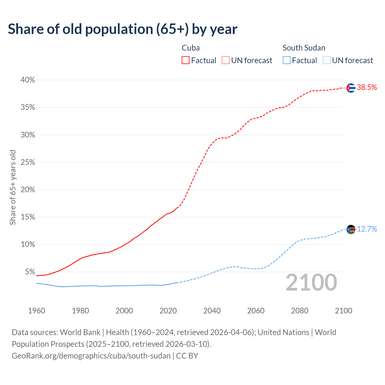 - The share of old-age demographic (65+) in Cuba is 16.6% vs 2.99% in South Sudan.